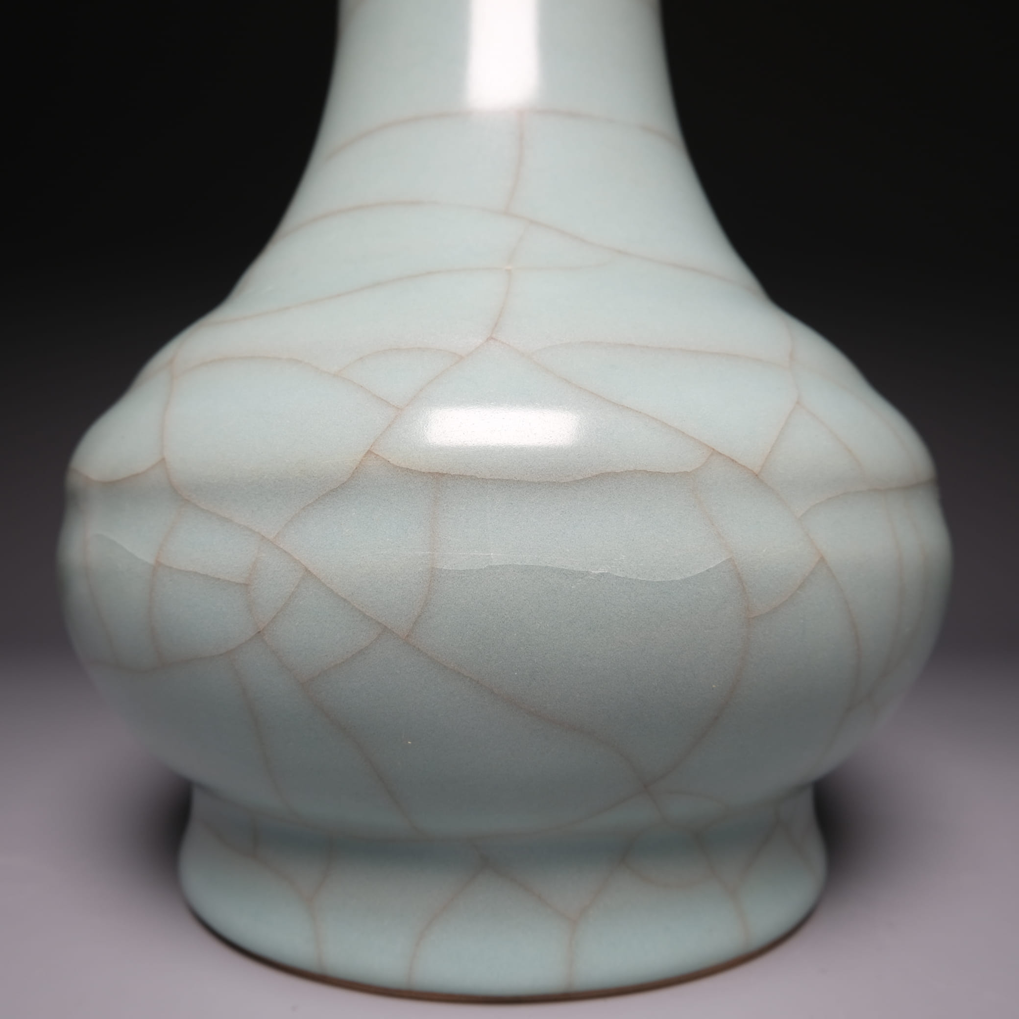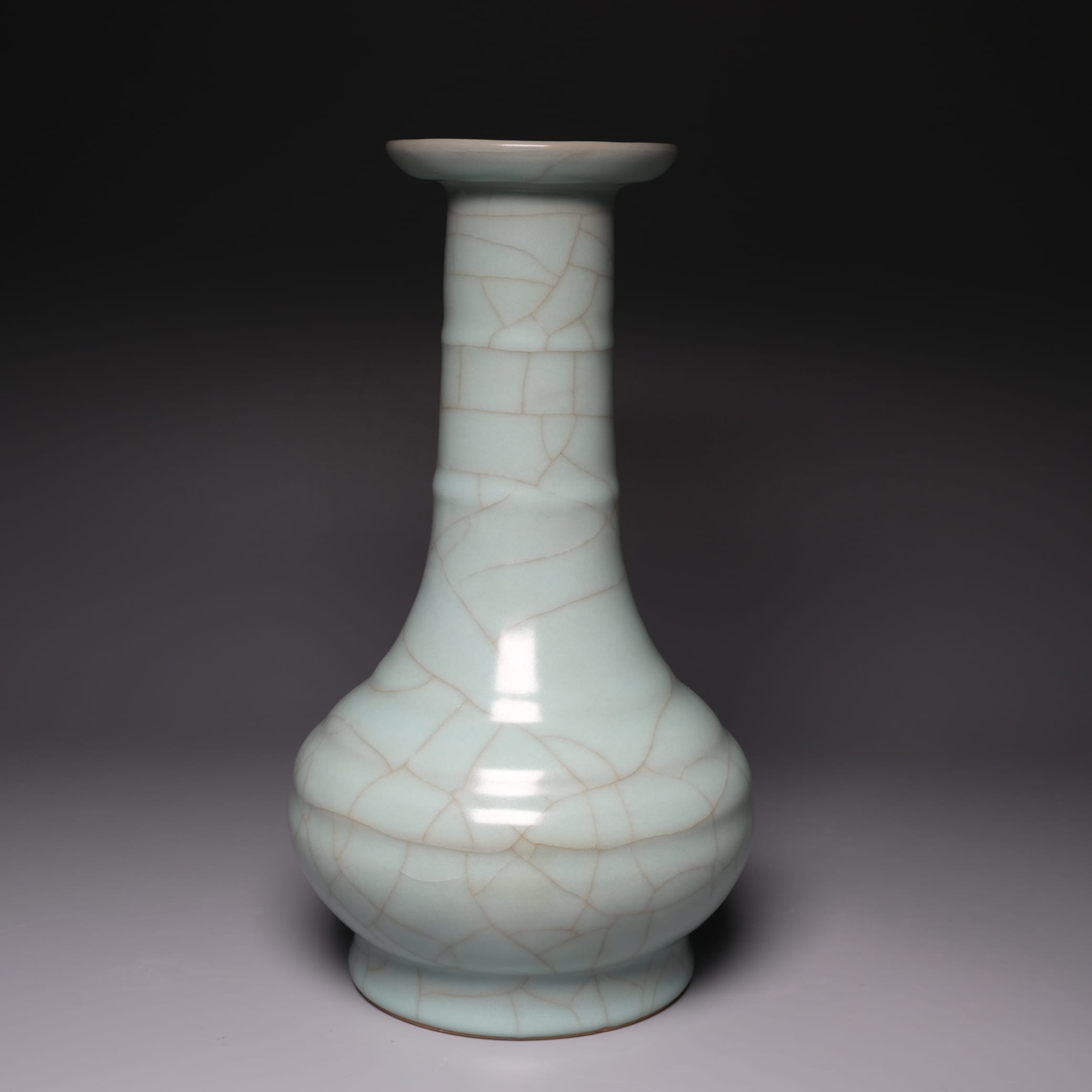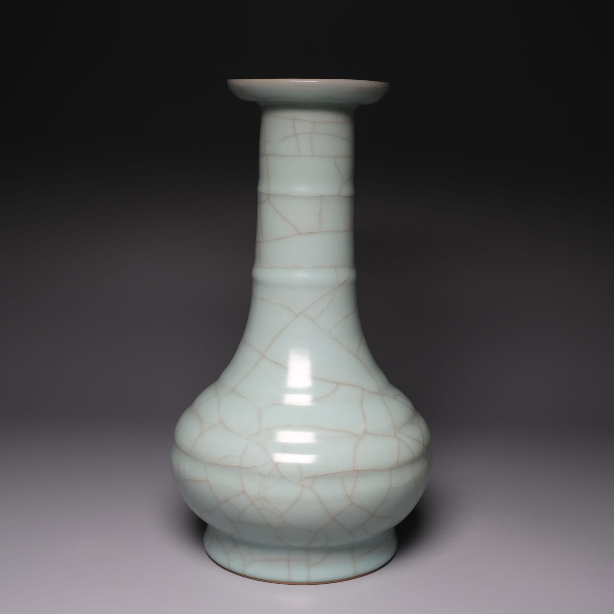 弦紋瓶呈現高挑修長的姿態,「頸長、腹飽、弦紋環繞」的典型觀賞瓶式。肩部圓潤自然,腹部線條流暢,下腹略為飽滿,上收成細頸,頸部再向上延伸至外撇的瓶口。盤口平折唇,直長頸,圓腹,瓶底略收,圈足。通體施天青釉,釉色呈現淡雅的青綠色,溫潤如玉,帶稀疏茶色開片紋,頸部與腹部各飾起線弦紋二道,像琴弦般規律分布,既有裝飾性,也增添立體感。圈足露胎。