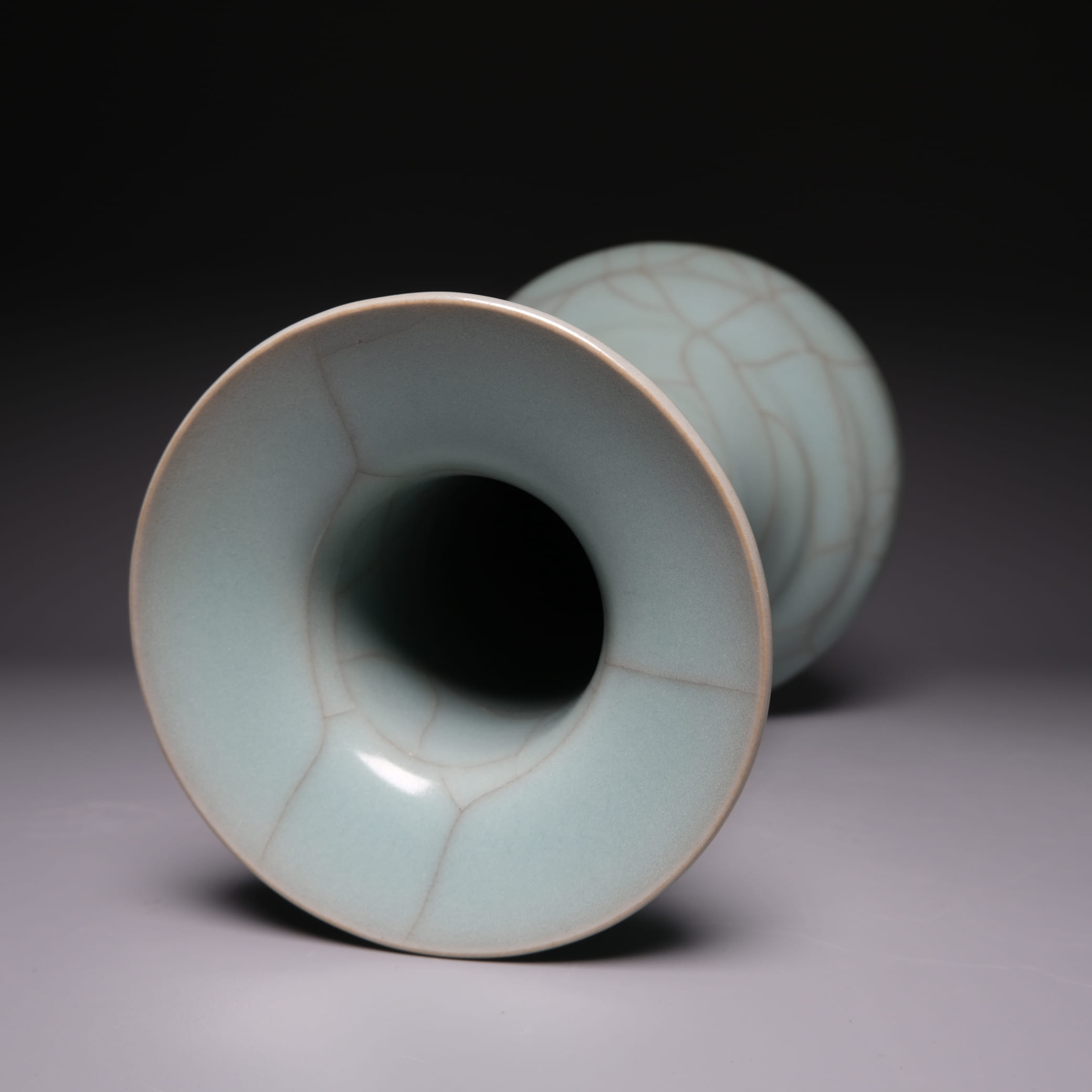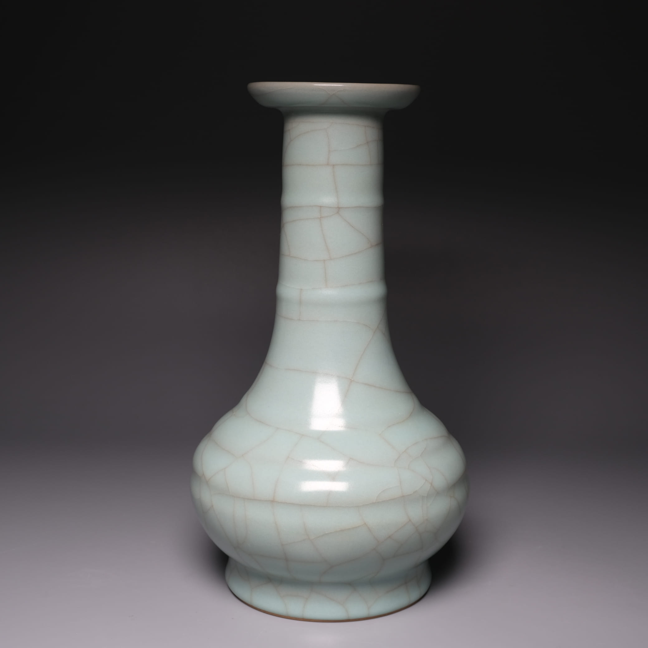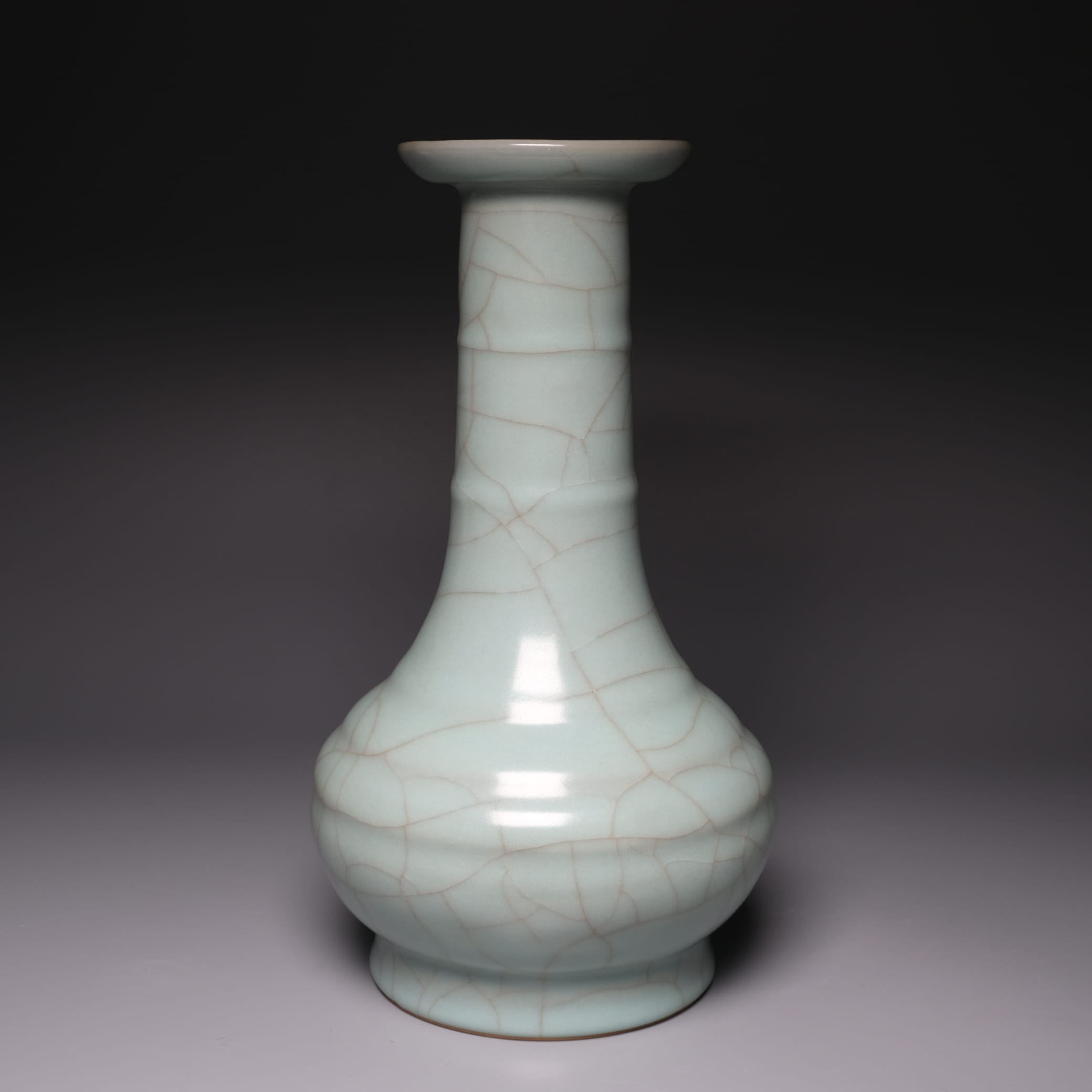 弦紋瓶呈現高挑修長的姿態,「頸長、腹飽、弦紋環繞」的典型觀賞瓶式。肩部圓潤自然,腹部線條流暢,下腹略為飽滿,上收成細頸,頸部再向上延伸至外撇的瓶口。盤口平折唇,直長頸,圓腹,瓶底略收,圈足。通體施天青釉,釉色呈現淡雅的青綠色,溫潤如玉,帶稀疏茶色開片紋,頸部與腹部各飾起線弦紋二道,像琴弦般規律分布,既有裝飾性,也增添立體感。圈足露胎。