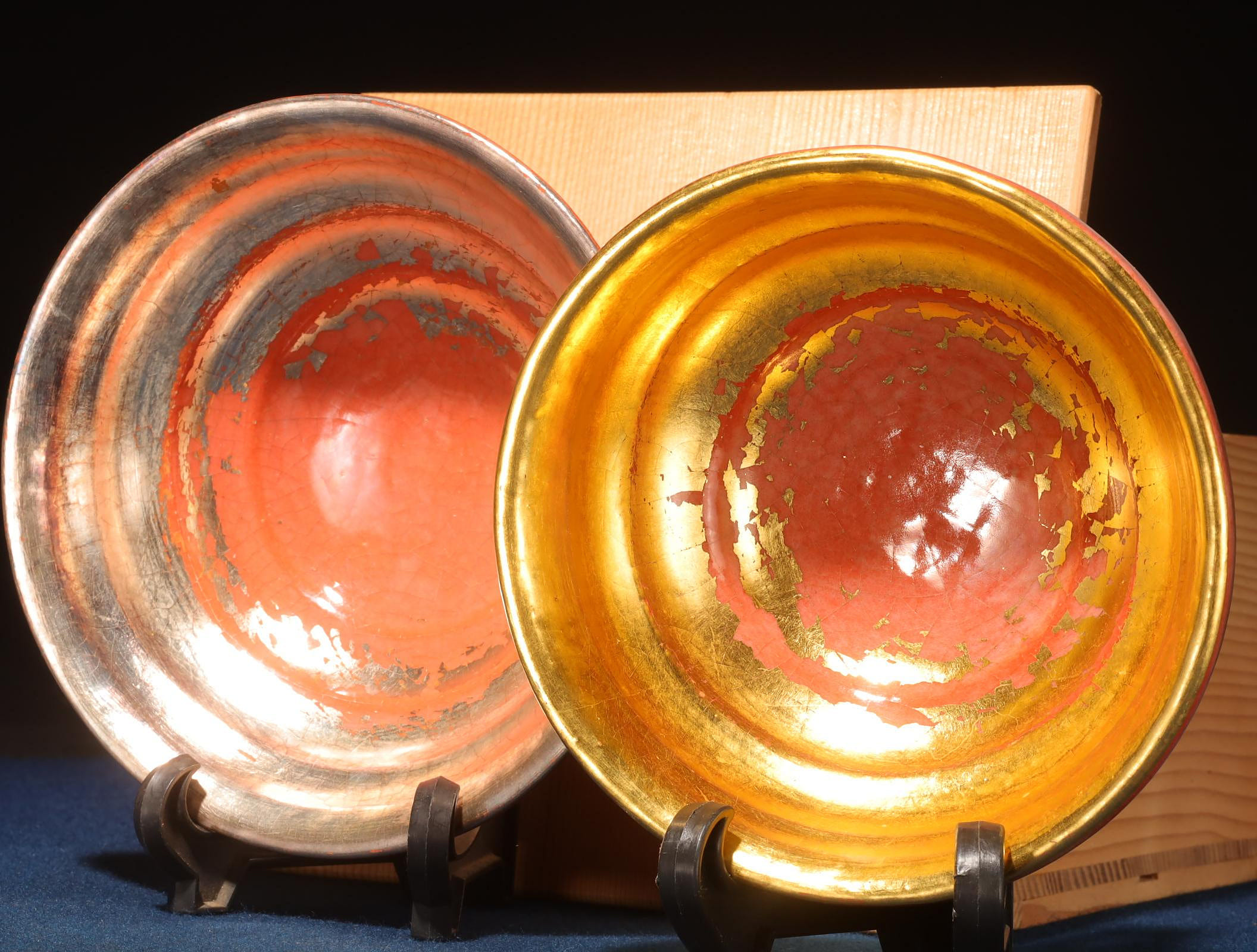 日本茶道 桂窯 嶋台茶碗 赤樂內金銀