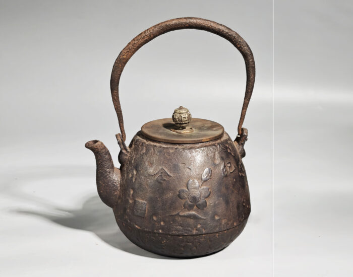 凱旋紀念壺是一件兼具工藝美感與紀念日俄戰爭勝利的歷史意涵的收藏品。主體為鑄鐵,壺身呈橢圓鼓腹狀,重心低穩,給人一種沉靜厚重的感覺。表面略帶粗糙質地,顯示出鑄鐵的原始肌理,並透出歲月痕跡。表面以浮雕技法呈現櫻花圖案,花瓣層疊細膩,既有春日柔美,也象徵凱旋與祝福。櫻花在日本文化中象徵「短暫而美麗的人生」、「凱旋與祝福」。櫻花紋及凱旋紀念浮雕字與壺身融合自然,展現職人對自然意象的掌握。銅蓋設計,銅質可避免由於蒸汽而生鏽的麻煩。常見於明治至昭和時期的高級京都鐵壺,銅蓋設計精緻,蓋面中央鑄有花形鈕,如蓮蕊綻放,既是實用構件,也是視覺焦點。