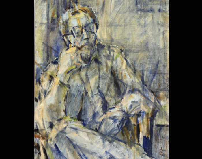 這幅作品若是由林長雄於1983年創作,描繪李德老師沉思神情,戴眼鏡、手托腮,傳達出內省、智慧與歲月的痕跡。畫面以藍灰色調為主,輔以黃色與赭紅,筆觸鬆散而富動感,筆觸細膩,色調沉穩,作品中幾乎沒有輪廓線,全部以筆觸與色點結構出主要造形,筆觸如風,色彩如霧。人物彷彿要消融在藍色的背景當中,有種晃動模糊的不確定感,呈現出一種夢幻與印象交織的氛圍,近似漂浮虛無的存在。