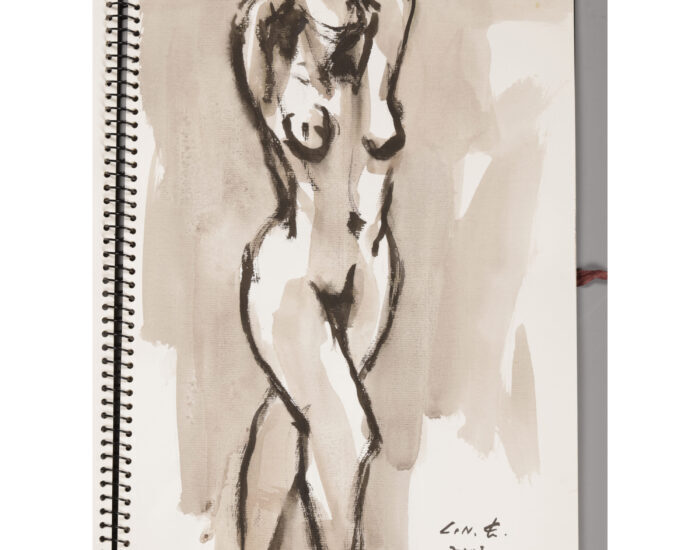 這組《名家速寫 冊頁(22幀) 人體 林長雄》作品,是林長雄老師於2003年創作的人體速寫冊頁,展現了他對人體結構與動態的深刻掌握與藝術表現力,不拘泥於寫實比例,而重視動勢與情感流動。屬於早期創作,保存狀況良好,具藝術與學術價值。速寫冊頁,共22幀,以炭筆或墨筆快速描繪人體姿態。2008年,簽名與年份清晰可見。黑紅墨線交錯,筆觸奔放,線條流暢,富有動感與情感張力。