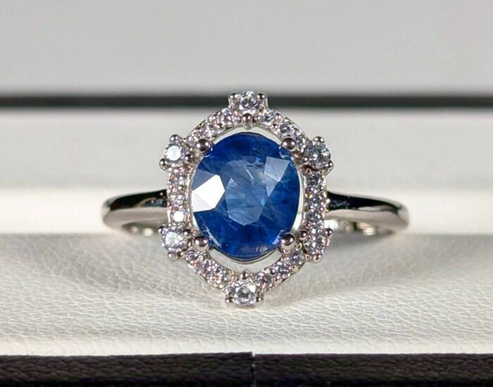 來自斯里蘭卡的天然矢車菊藍藍寶石,1.54克拉的純淨藍光,色澤濃郁、切工精準,宛如晨曦中的湖面閃耀。 銀台設計襯托主石的高雅,周圍鑽飾如星辰環繞,低調卻不失華麗。 台大國際寶石鑑定所證書。矢車菊藍,是藍寶石中最純粹的色階,象徵真摯與堅定。