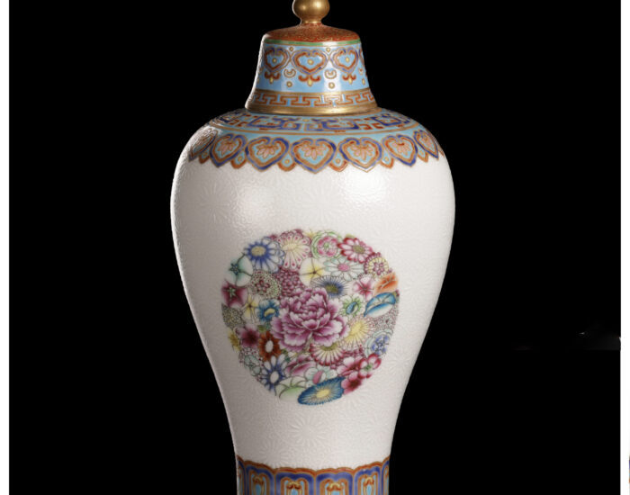 此件帶蓋梅瓶,形制挺拔端莊,胎質堅實緻密,蓋安燭焰鈕,作撇口、短頸,豐肩,腹身飽滿向下漸收,底承圈足;面施琺瑯彩,設色妍麗,肩部及近足處分別飾蕉葉紋、夔龍紋、如意雲紋等,腹身飾以團花紋,極富吉瑞祥禎之意,整觀佈局繁滿,工藝嫻熟老練,韻致高雅大器。