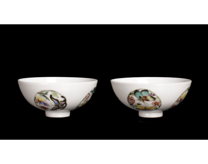 本品茶盞一對,胎質縝密,胎薄體輕,秀麗爾雅、小巧玲瓏,形制規整端莊,呈圓口、弧腹、圈足,面施粉彩,內白釉無紋,外壁繪粉彩團蝶紋四組,各彩繪雙蝶相向穿花成圓,舞蝶戀花,花妍盛綻,葉片舒展交錯,迎來蝴蝶飛至,色澤清麗妍美,線條流暢自然,整制運藝精熟,比例對稱和諧,韻致恬雅雋永,深足小圈內以宋楷紅料底書「雍正年製」二行四字,字體工整秀麗。對盞作工精細,在細膩如玉的白瓷地上,花叢間彩蝶飛舞,百花勝放,繪畫精細典雅型制典雅,展現了雍正時期工藝的精緻與高雅品味。