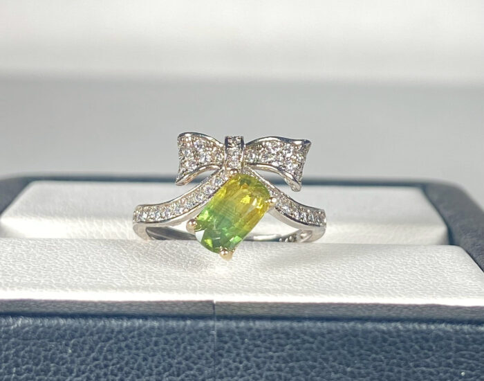 來自非洲的天然藍寶石,黃綠雙色1.15克拉的銀戒,主石懸掛於蝴蝶結造型中央,以四爪鑲嵌固定,展現垂墜感與立體層次。主石顏色由黃、綠逐漸過渡到藍色的雙色藍寶石。台大國際寶石鑑定所證書。