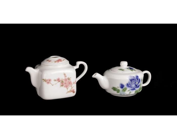 白瓷方扁壺形,四角圓潤、體態緊湊,短嘴與彎曲把手比例協調,蓋頂有小通氣孔,製作工法顯細緻。器身一側與蓋面繪水點梅花,色調以粉彩或淡釉下彩為主,枝幹與花瓣筆觸細膩,布局簡潔典雅;另一側以白字「香中別有韻,清極不知寒」。瓷質細密,釉面光澤溫潤,繪畫細膩生動,色彩清新淡雅。底款:中南海懷仁堂|珍品|陶瓷研究所|一九六二年|監製。顯示為當代官方或單位訂製器物若為1962年出品,符合新中國建國後官辦或研究所體系下的工作室作品特徵:工藝規範、風格介於傳統與當代之間。