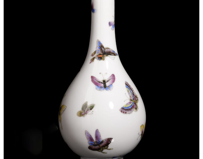 膽瓶造型秀雅,胎體厚實堅緻,作圓口長頸,弧腹飽滿向下漸收,底承圈足,釉面勻淨腴潤,面施粉彩繪彩蝶圖,色澤恬雅秀麗,蝶翅色彩斑斕,或粉紫含露、或明黃綴金、或青藍泛光,羽翼紋路細膩入微,或振翅欲飛,或斂翅小憩,刻畫生動逼真,盡顯自然意趣;整器運藝精湛,饒富吉祥美好之意韻。