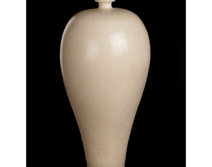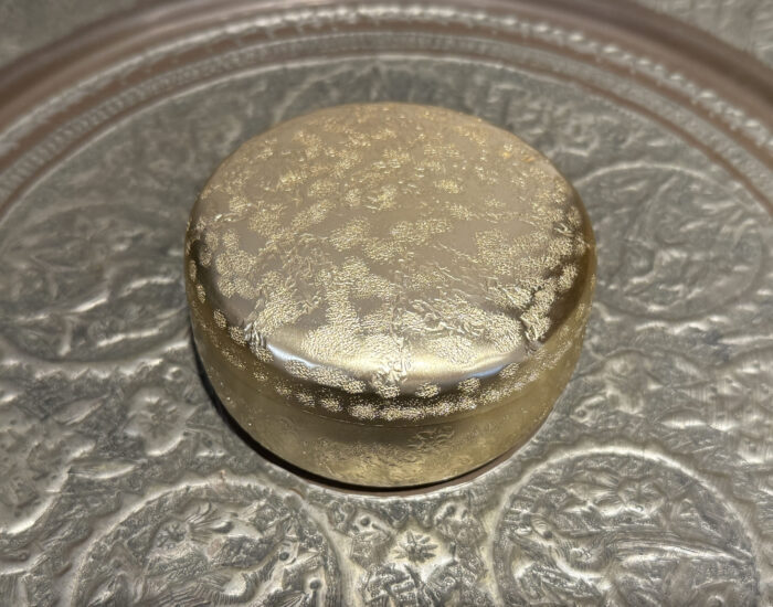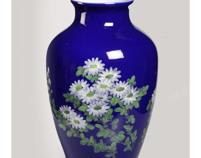 茶盞呈現經典的圓潤輪廓,口沿略收,腹部圓潤有泡泡盞的曲線,盞身高低適中,曲線流暢,底部收束成小圈足,適合手持品茗。整體以深藍至青藍為基調,釉面光澤柔和,在特定角度下呈現微妙的色彩層次,盞內一抹紅色斑點如火焰般在藍釉中綻放,有如晚霞映照水面,形成強烈視覺焦點,圈足及底部露胎未施釉,小圈足對於茶湯的保溫有利,減少熱量傳導逸失。日本的鈞釉主要受中國鈞窯啟發而製作的,具有藍色與紫紅色窯變效果的釉色瓷器,日本工匠在學習中國陶瓷技術的過程中,也對鈞窯的窯變藝術產生興趣,並進行仿製和改良,通常在近代(如大正時期約1912-1926)製作,帶有類似中國鈞窯(尤其是宋元鈞窯)那種藍中帶紫、紅斑的窯變釉色,這些器物模仿了中國宋元鈞窯的窯變神韻。