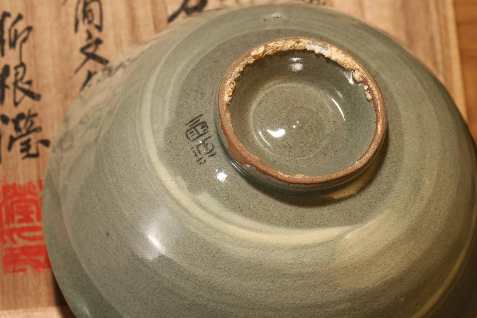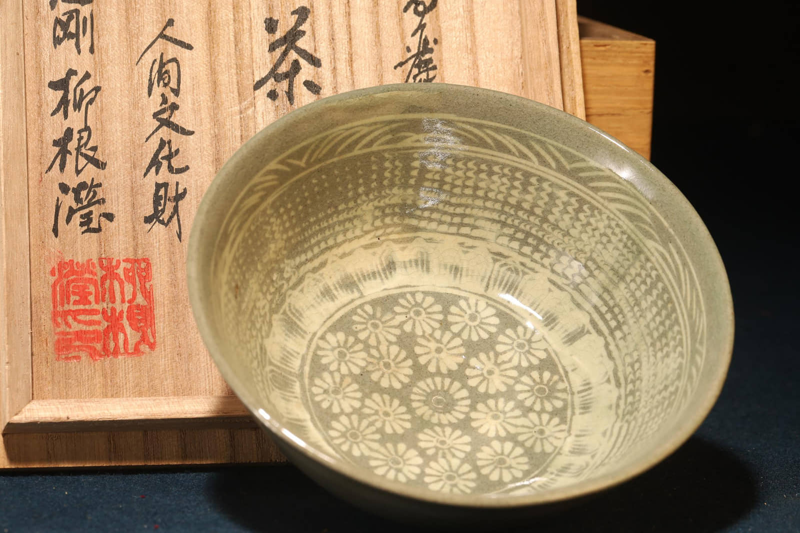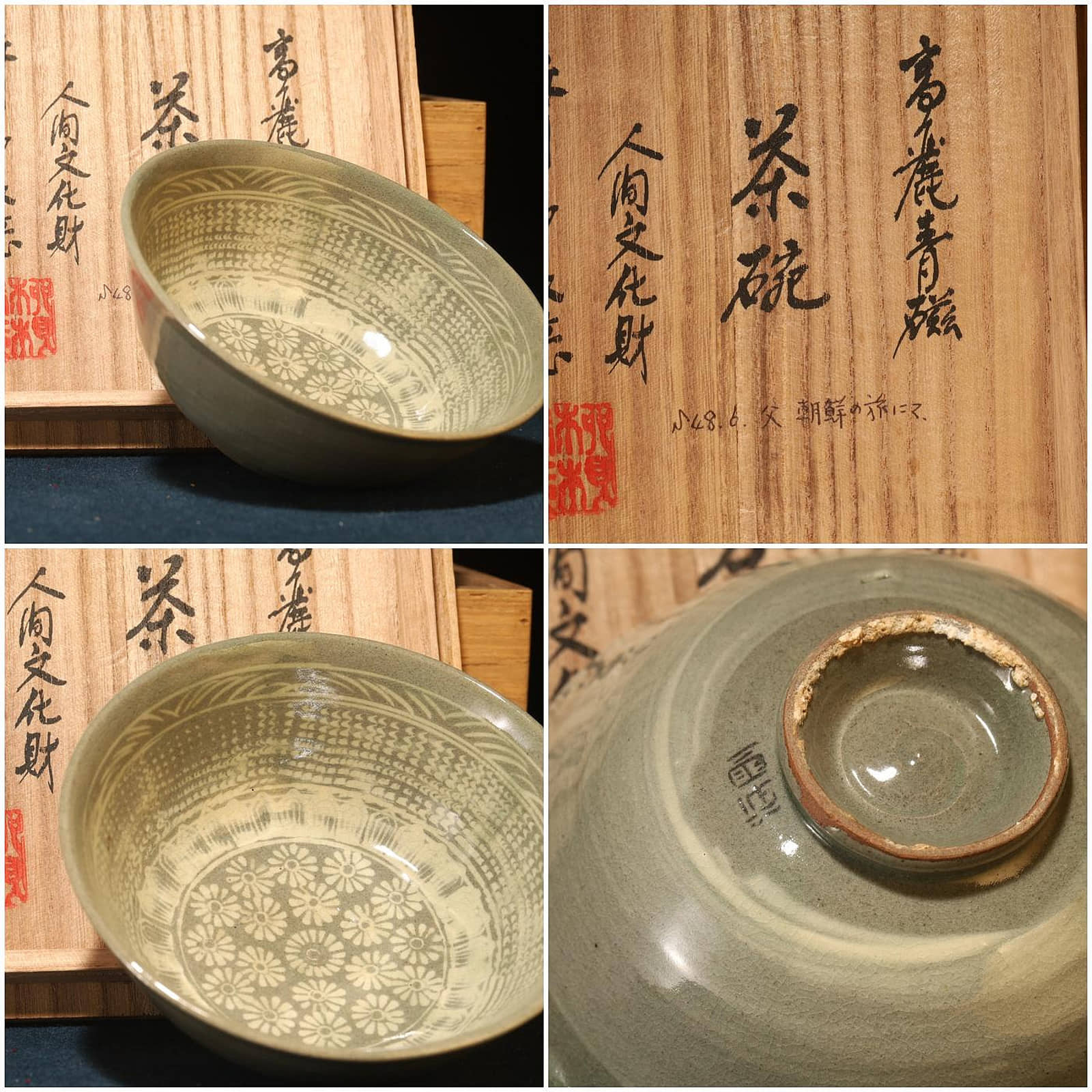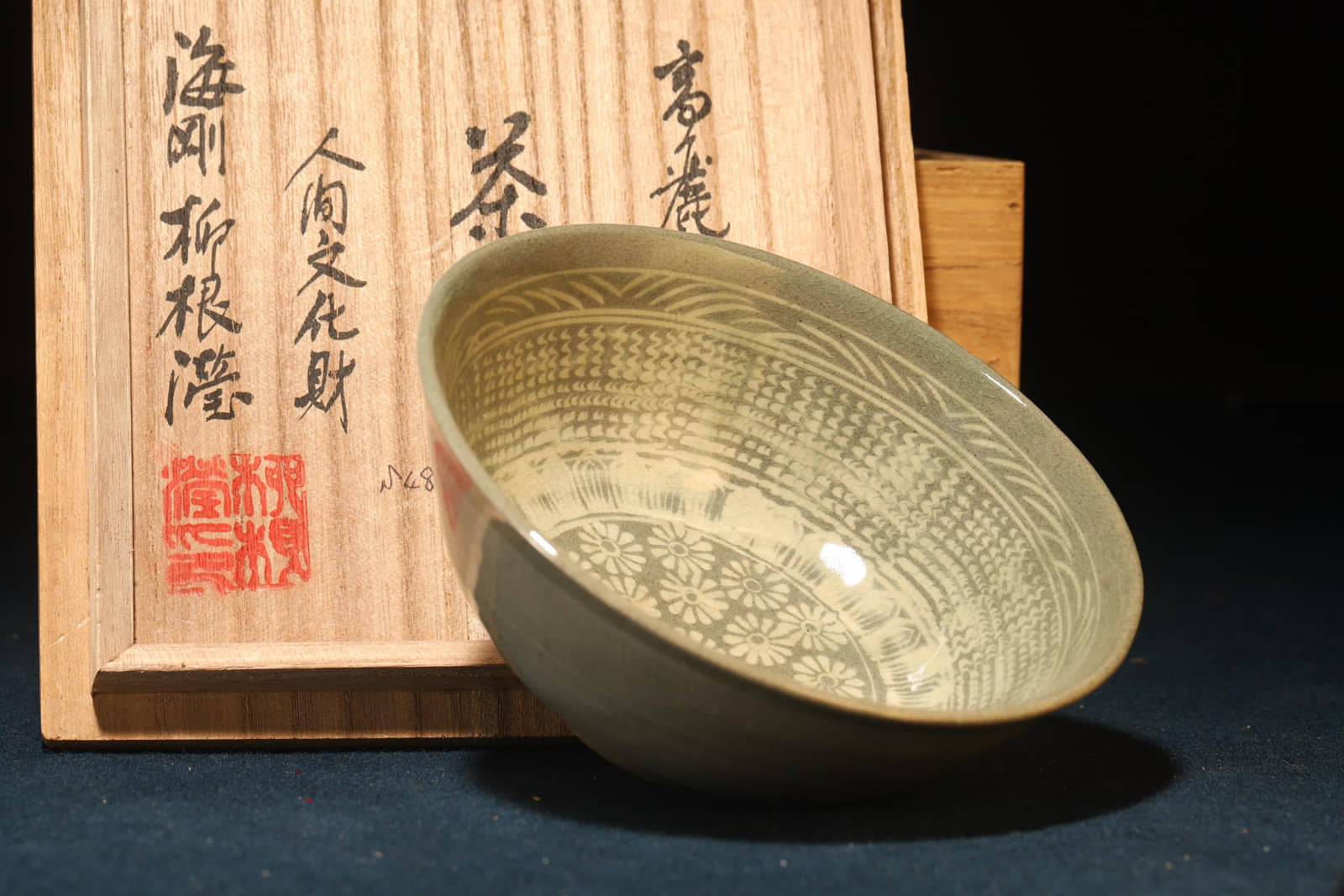 高麗青瓷 人間文化財 柳海剛 (柳根瀅) 象嵌千菊茶碗 原共箱