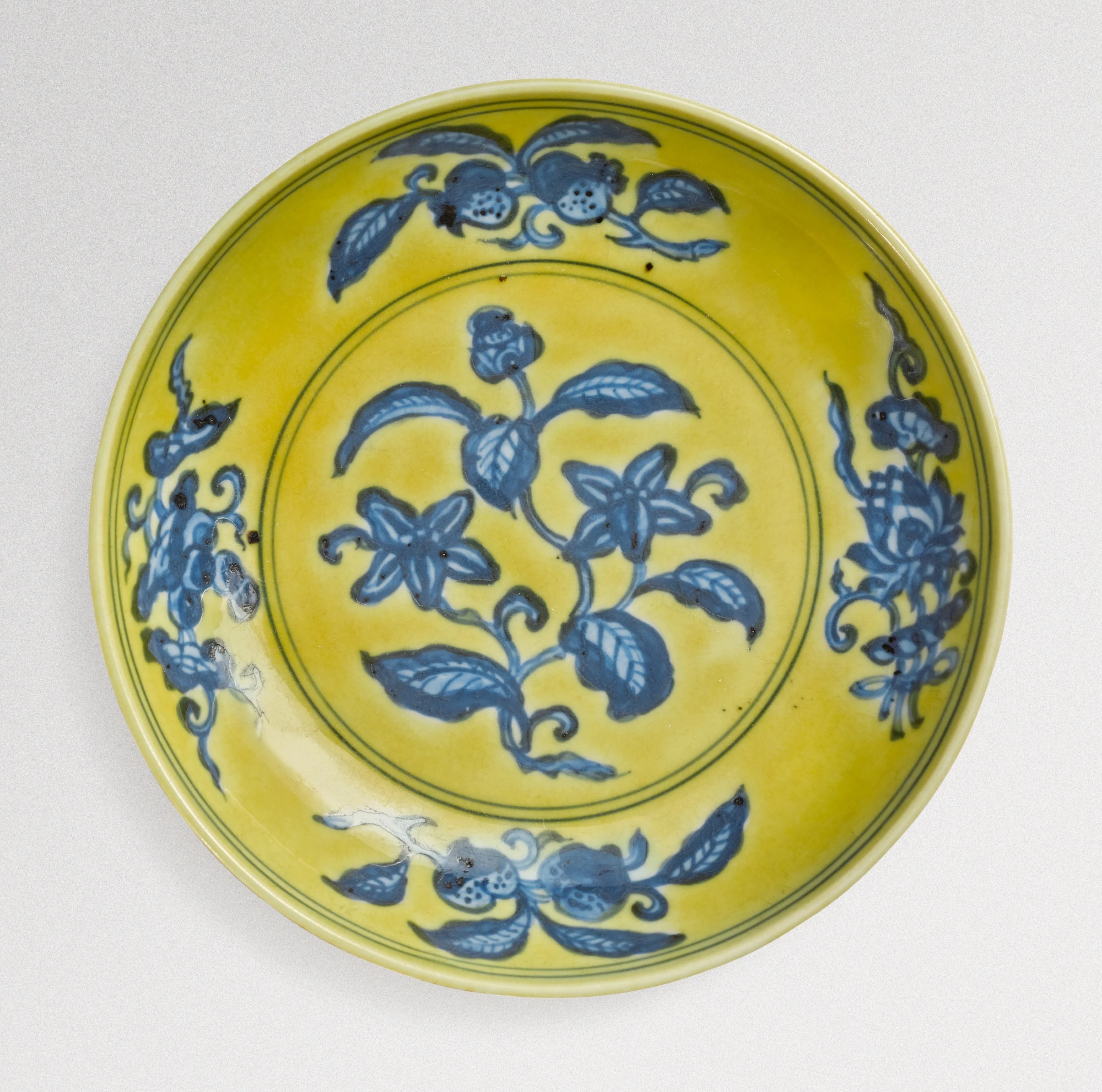 此類黃彩地青花盤的式樣自宣德開始,歷經成化、弘治、正德直到嘉靖都有燒造,到萬曆時則有青花龍紋黃釉地的紋飾。清代亦有燒造寄年款。
