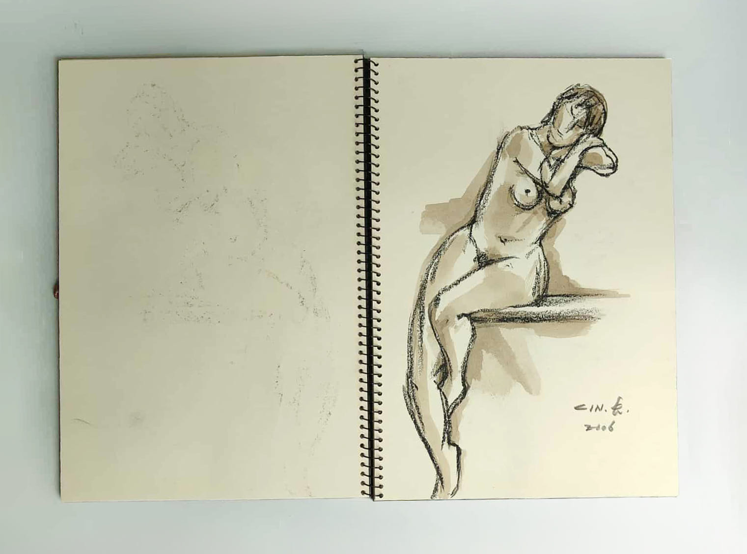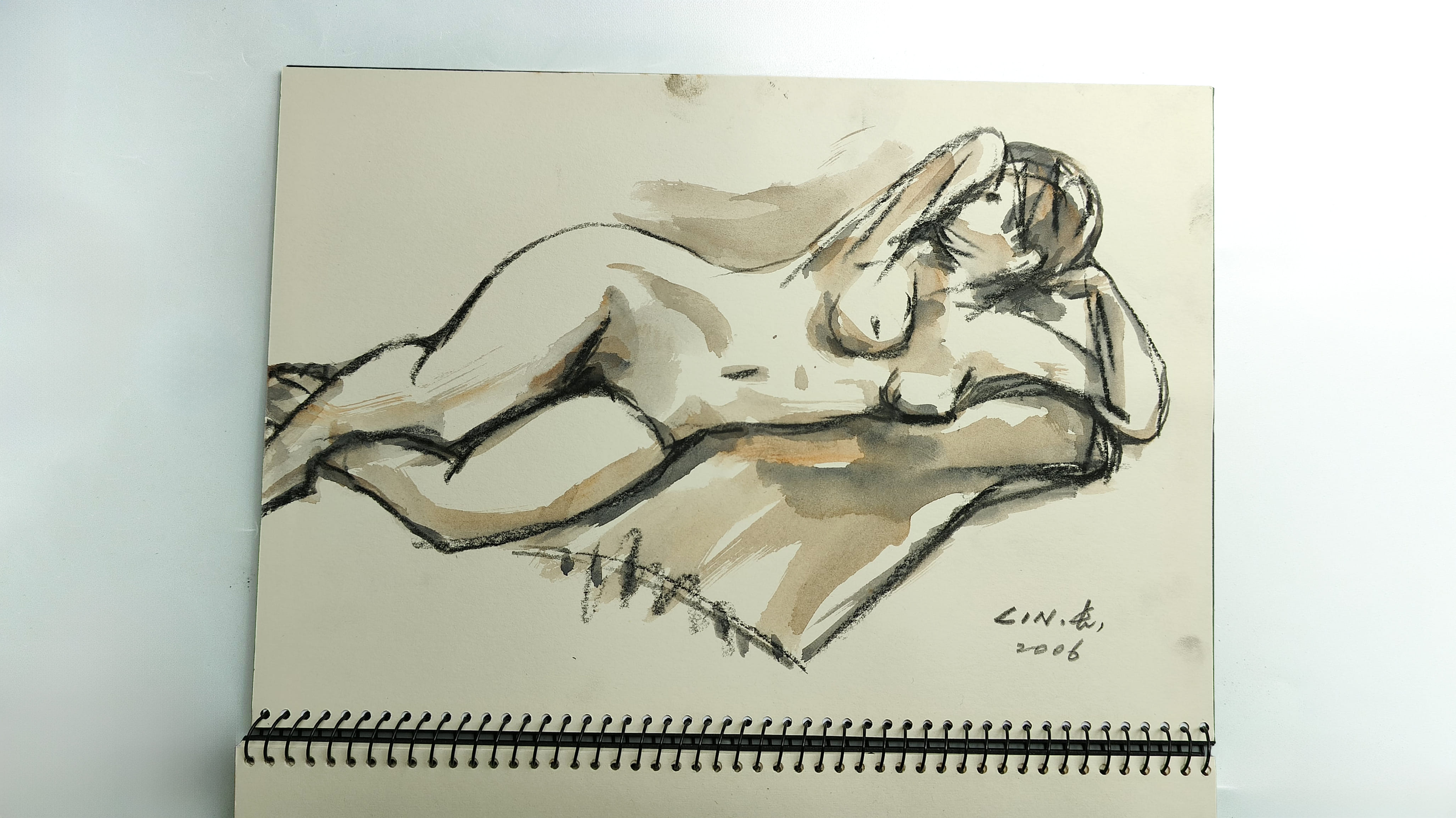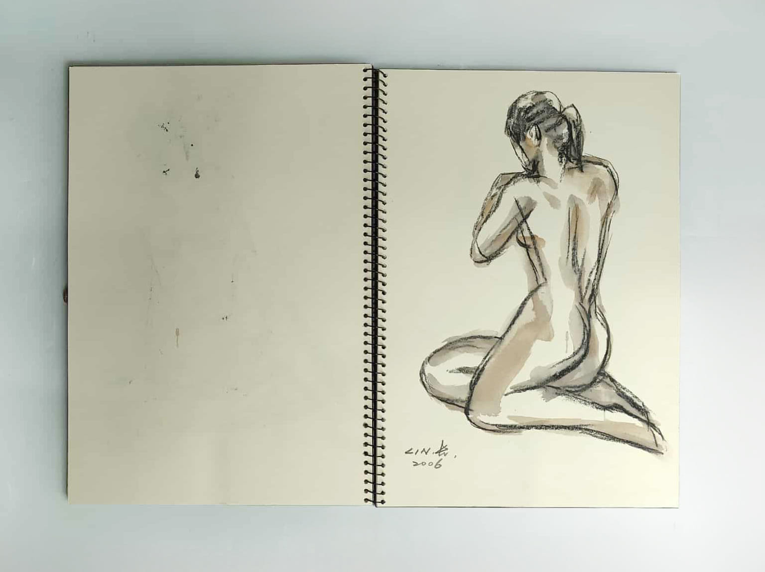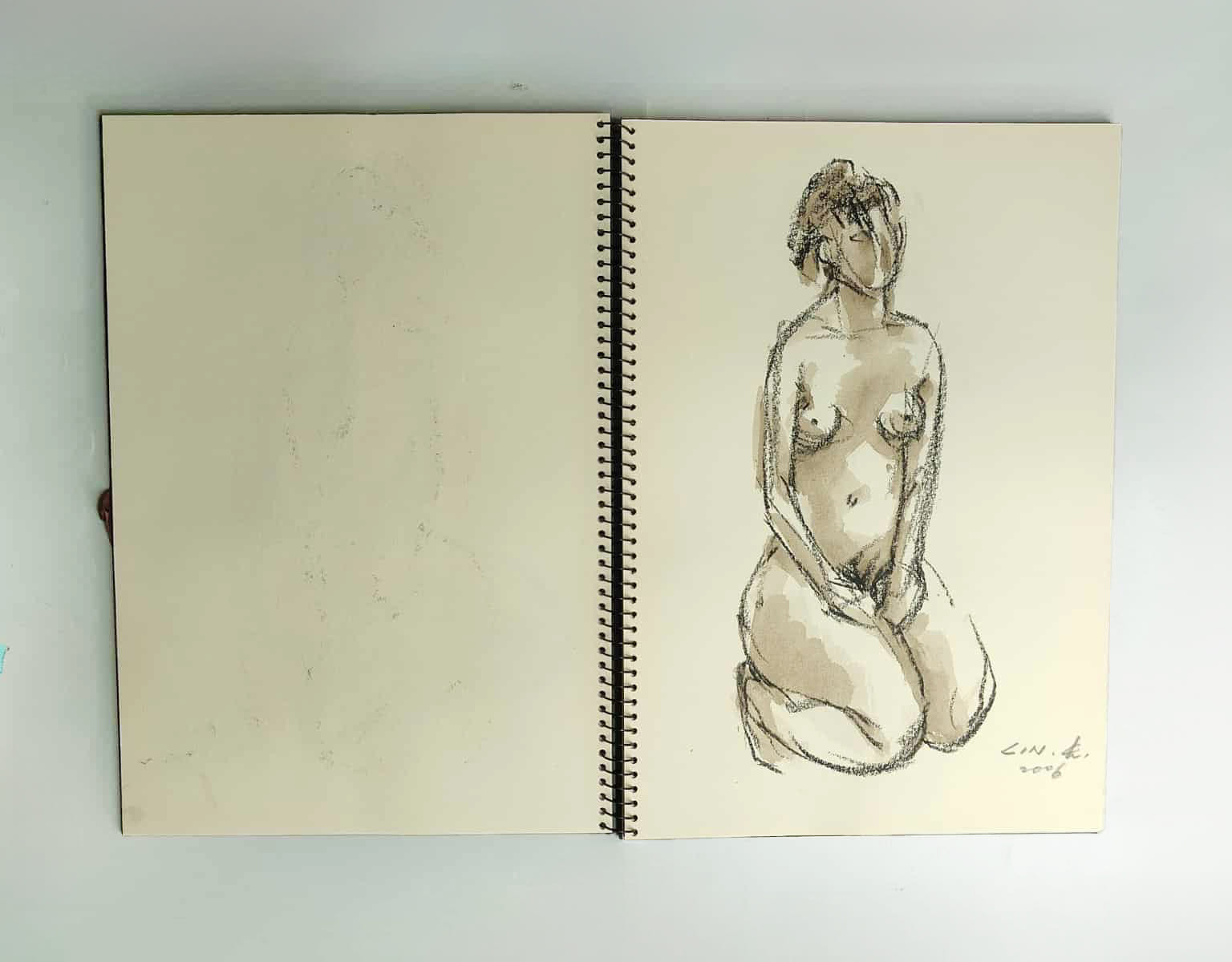 速寫冊頁:在藝術教育與創作中,速寫是訓練觀察力與手眼協調的重要方式,也常作為創作前的構圖練習。人體是藝術史中最具挑戰性的題材之一,林長雄以自由筆觸描繪人體,展現其對生命與動態的敏感度。筆法近似東方水墨的「寫意」,但結構與比例則承襲西方素描訓練,形成獨特風格。