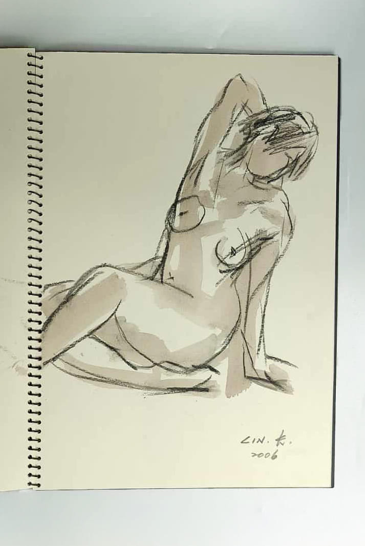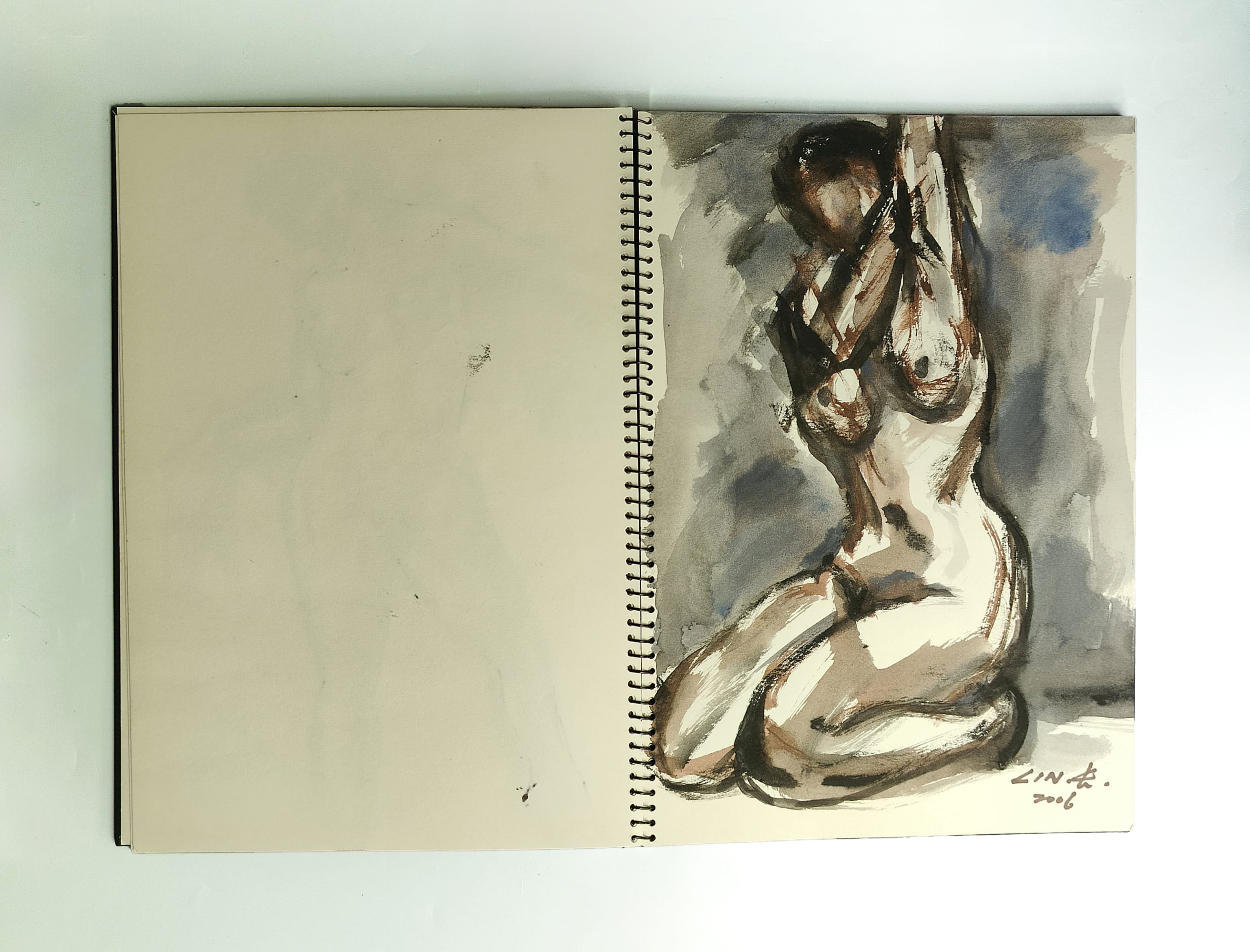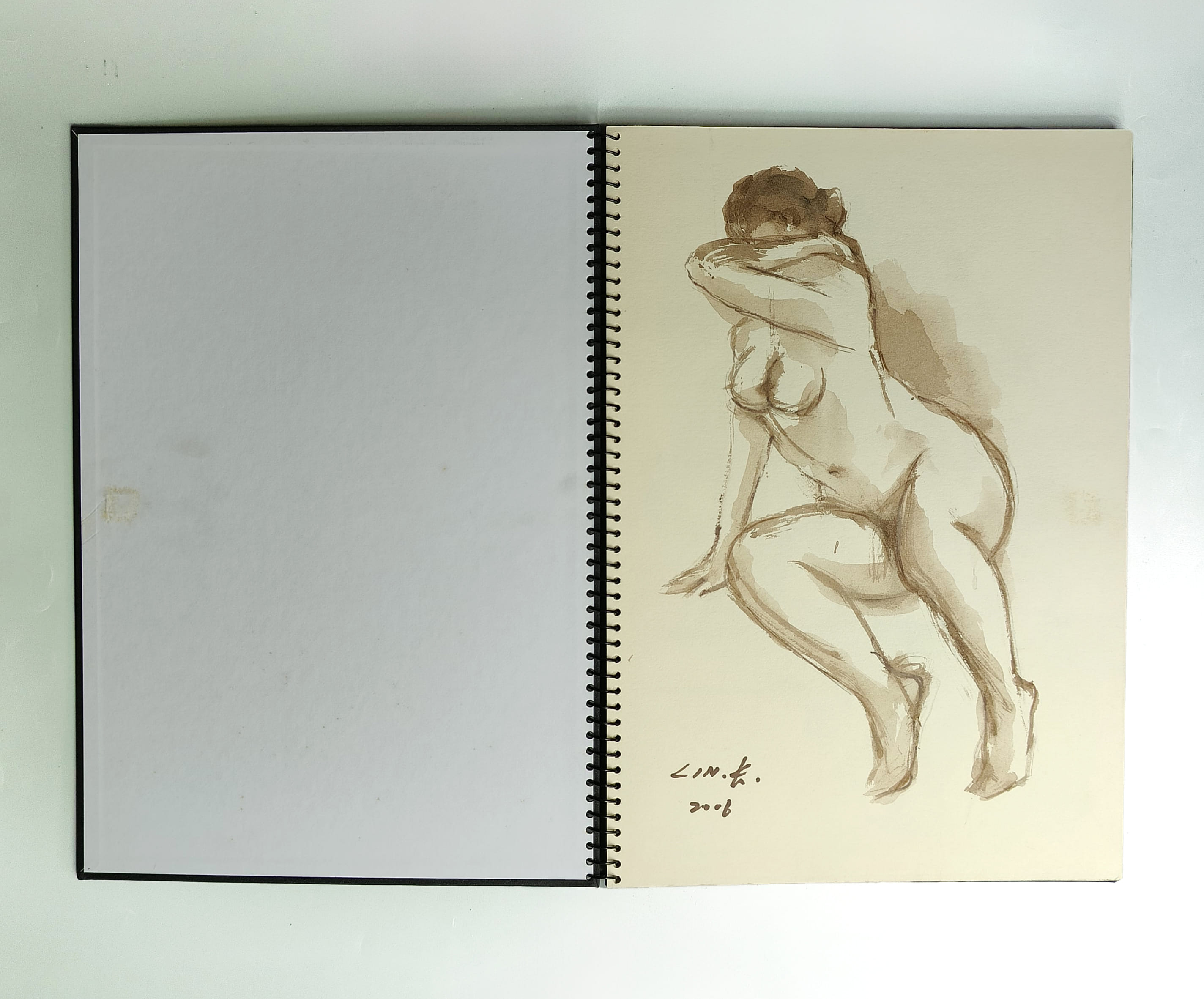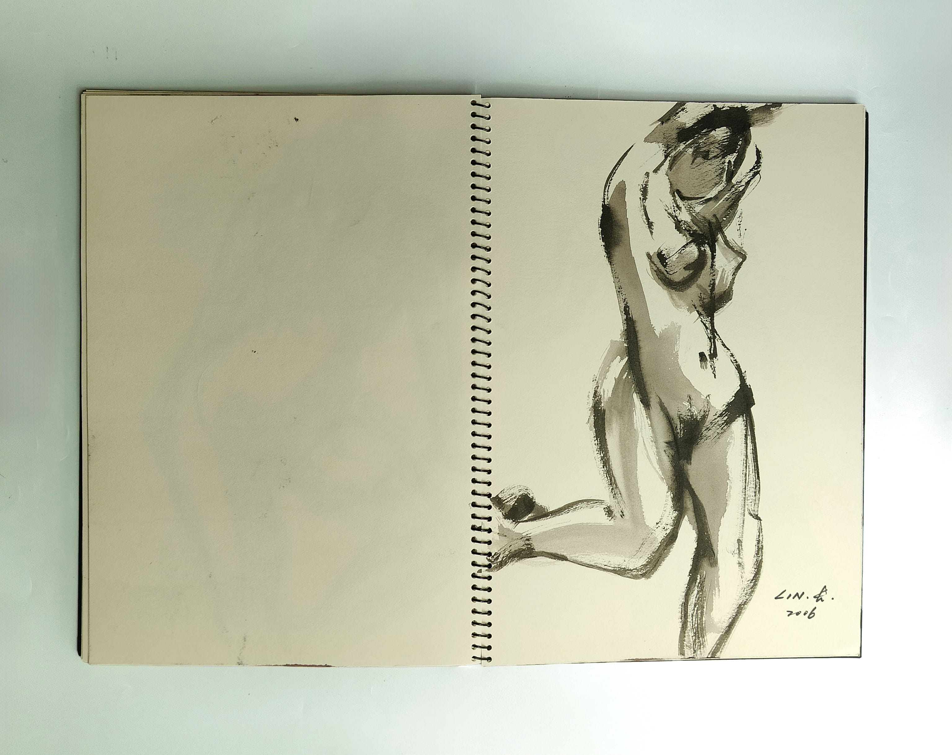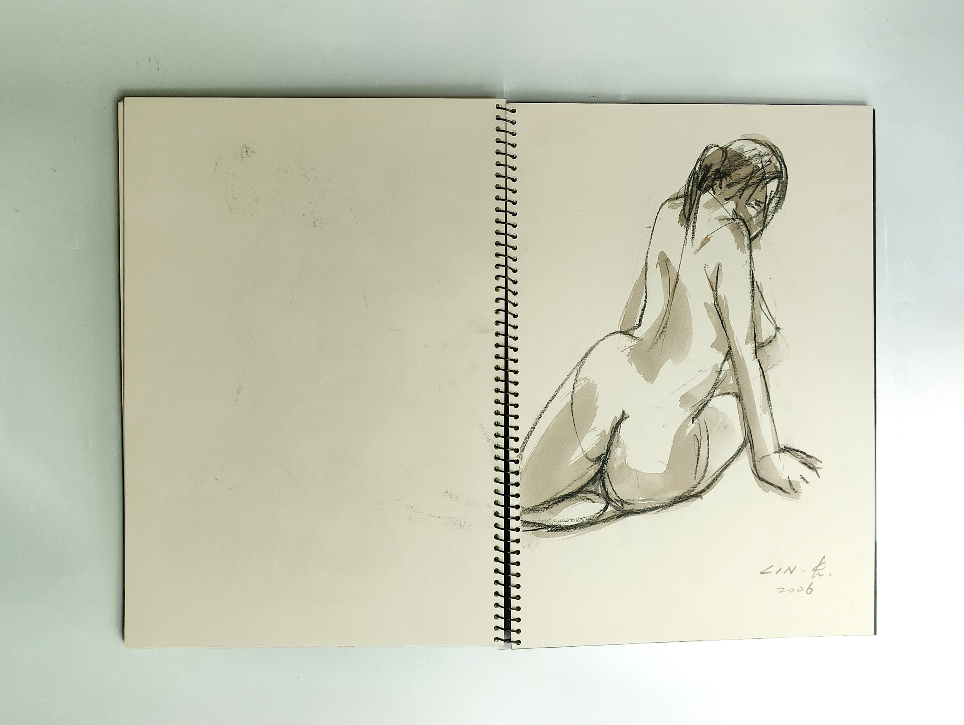 速寫冊頁:在藝術教育與創作中,速寫是訓練觀察力與手眼協調的重要方式,也常作為創作前的構圖練習。人體是藝術史中最具挑戰性的題材之一,林長雄以自由筆觸描繪人體,展現其對生命與動態的敏感度。筆法近似東方水墨的「寫意」,但結構與比例則承襲西方素描訓練,形成獨特風格。