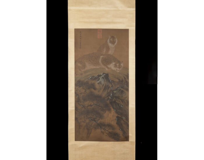 本幅《雙豹圖》出自明代宮廷畫家蕭海山之手,描繪兩隻豹蹲伏於山石之上,一警一靜,神態各異,畫中一豹張口低伏,顯示攻擊與威懾;另一豹端坐凝視,象徵沉穩與掌控。這種對比呈現了動靜相生、陰陽互補的哲理,透過猛獸的形象,傳達「剛柔並濟」的治世理念。畫家以細膩筆法勾勒豹身斑紋與肌理,展現出動物的力量與靈性。背景以淡墨渲染山石與松枝,象徵自然的堅毅與長青,與豹的野性形成呼應,寓意國祚綿延、基業穩固。營造出野性與靜謐交融的氛圍。蕭海山擅畫山水動物,尤以鳥獸見長,其筆下之豹不僅形似,更神似,筆法細膩,毛色層次分明,設色淡雅,體現了明代宮廷畫院對寫實與氣韻的雙重追求。畫面左上方可見「武英殿錦衣蕭海山寫」款識,正上方有鈐印二枚「太上皇帝之寶」「巸(怡)親王寶」顯示此作曾為宮廷所藏。豹在中國文化中象徵勇猛與威嚴,常見於帝王象徵與軍事意象之中。本圖不僅為動物畫佳作,更蘊含深厚的文化意涵與宮廷藝術風格,堪稱明代畫壇珍品。「武英殿錦衣」通常指明代隸屬於錦衣衛、供職於宮中武英殿(明代重要的繪畫、儲存書畫之處)功俸者多為畫士,創作裝飾於御用器物和殿壁上的圖面。他們雖然不會武功,畫功卻十分了得,往往得到皇帝的賞識,才得以提拔授予錦衣指揮或鎮撫等官銜,並在武英殿待詔,負責創作書畫作品。