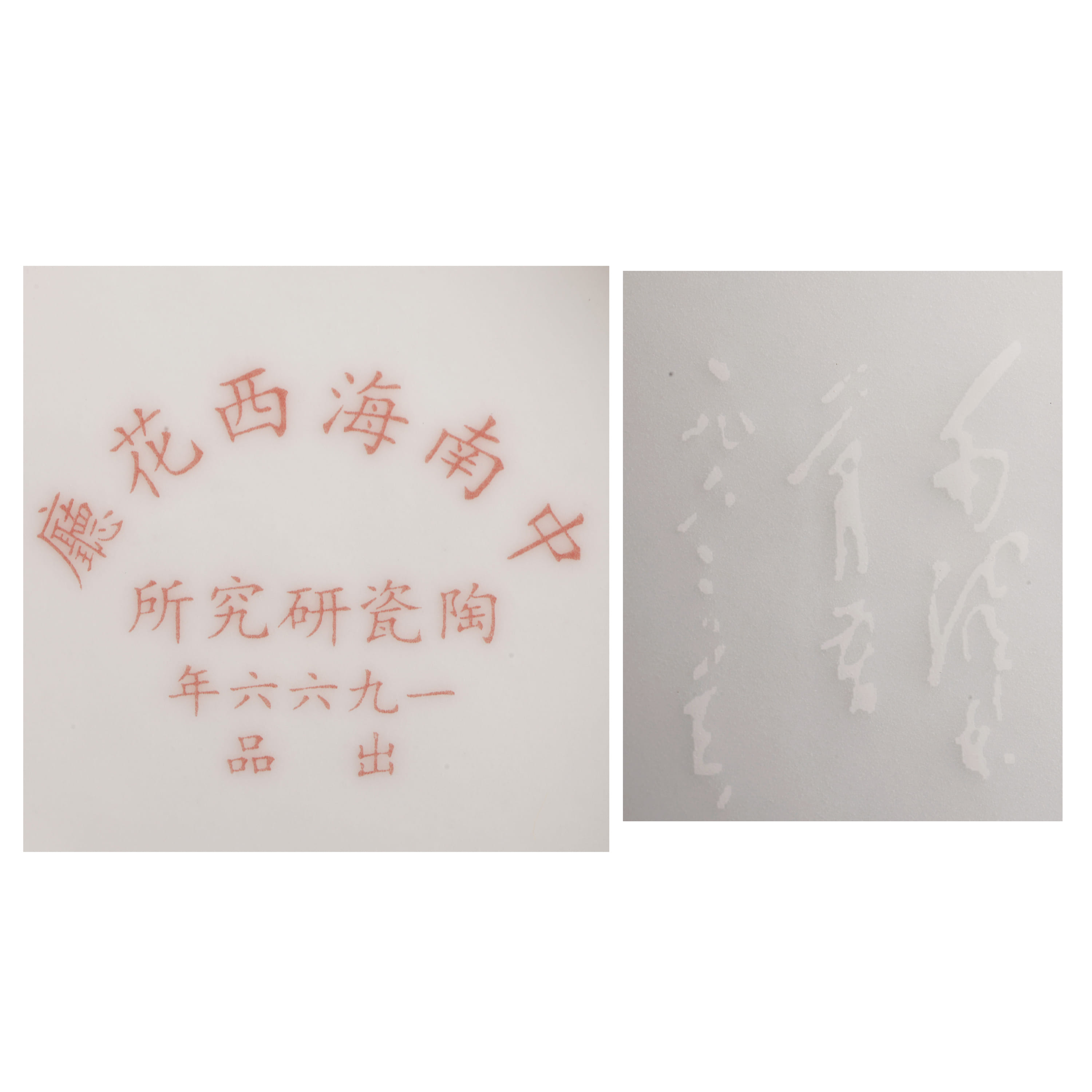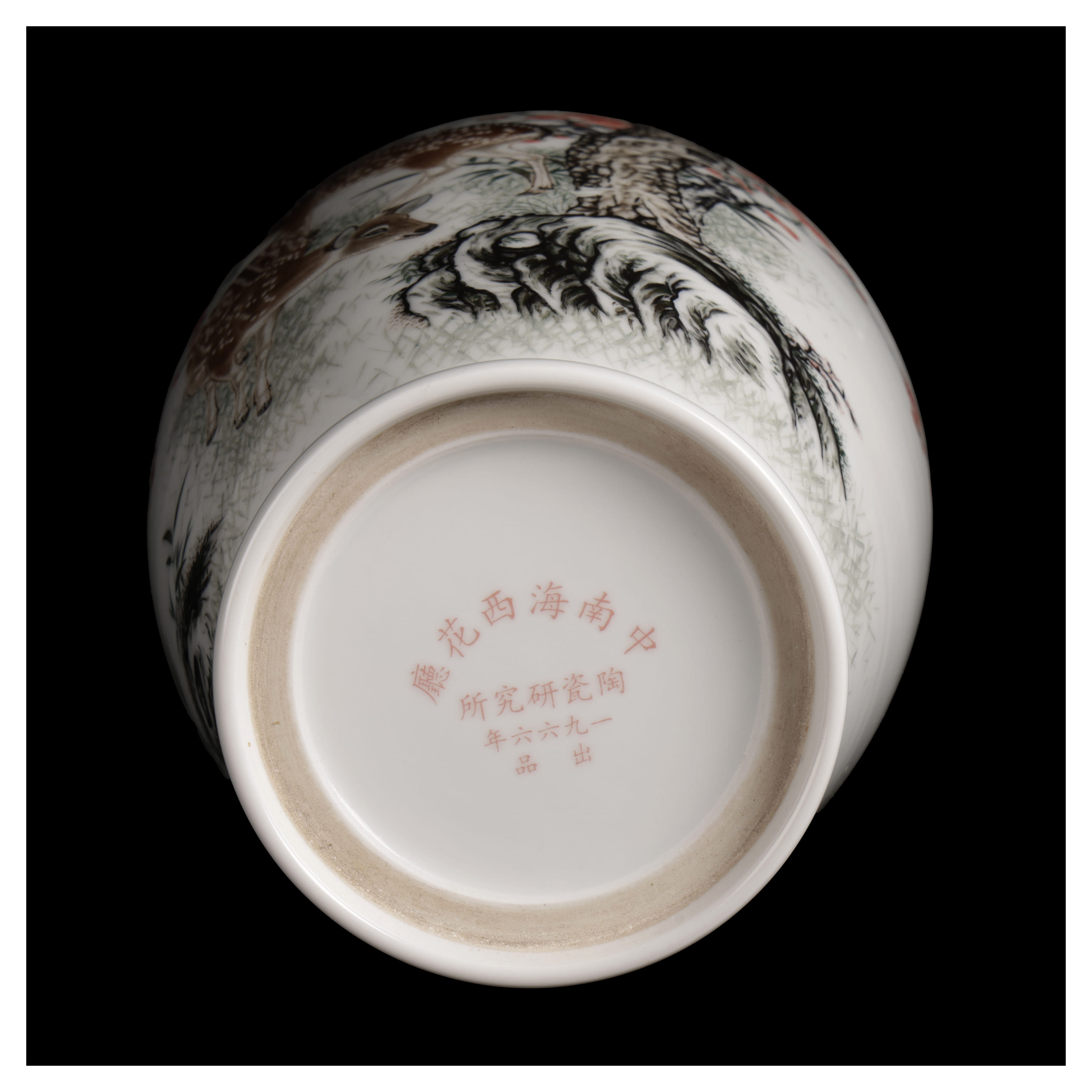 白如雪的瓶身以工筆,將鹿的毛色斑點、松樹的枝葉、岩石的紋理,都以工筆方式描繪,線條清晰,色彩層次分明,展現出傳統粉彩的精緻感。粉彩色調柔和、透明度高,營造出一種清雅、溫潤的氛圍,與清代粉彩的審美一脈相承。松樹象徵長壽,鹿象徵祿(福祿、俸祿),合起來寓意「福壽雙全」。這是典型的中國吉祥題材,既有裝飾性,也有文化象徵。另一側以白字「香中別有韻,清極不知寒」描繪梅花孤標傲雪的品格,與茶器的清雅氣質相得益彰。瓷質細密,釉面光澤溫潤,繪畫細膩生動,色彩清新淡雅。底款:中南海西花廳|陶瓷研究所|一九六六年|出品。賦予它鮮明的當代政治文化背景,使作品兼具藝術性與時代性。