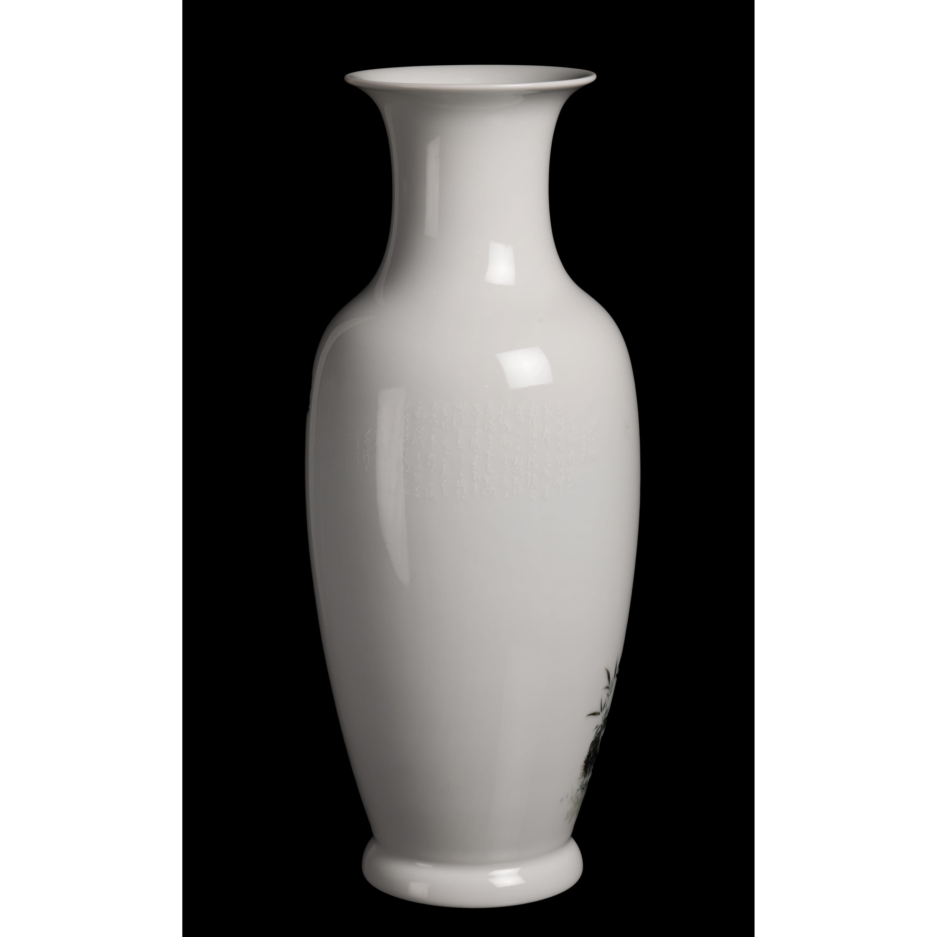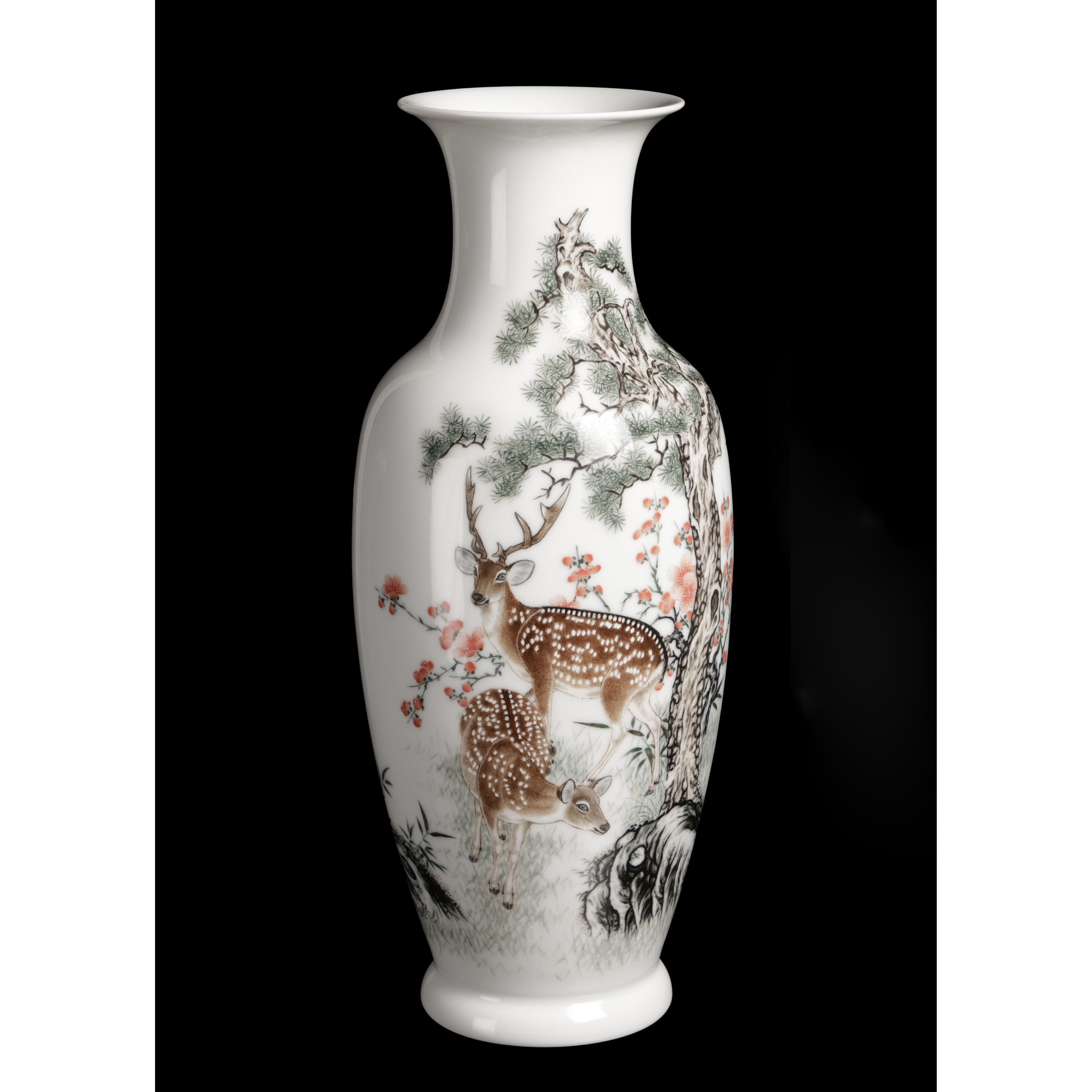 白瓷賞瓶,胎質潔白細緻如玉,器形高挑,比例勻稱,瓶口略微外撇,瓶頸細長,肩部過渡自然,曲線柔和,給人穩重而不生硬的感覺,瓶腹寬厚,為主要繪畫區域,鹿與松樹的圖案在此展開,構圖舒展,向下略收,瓶底圈足放大,穩定性強,整體重心下移,適合陳設。