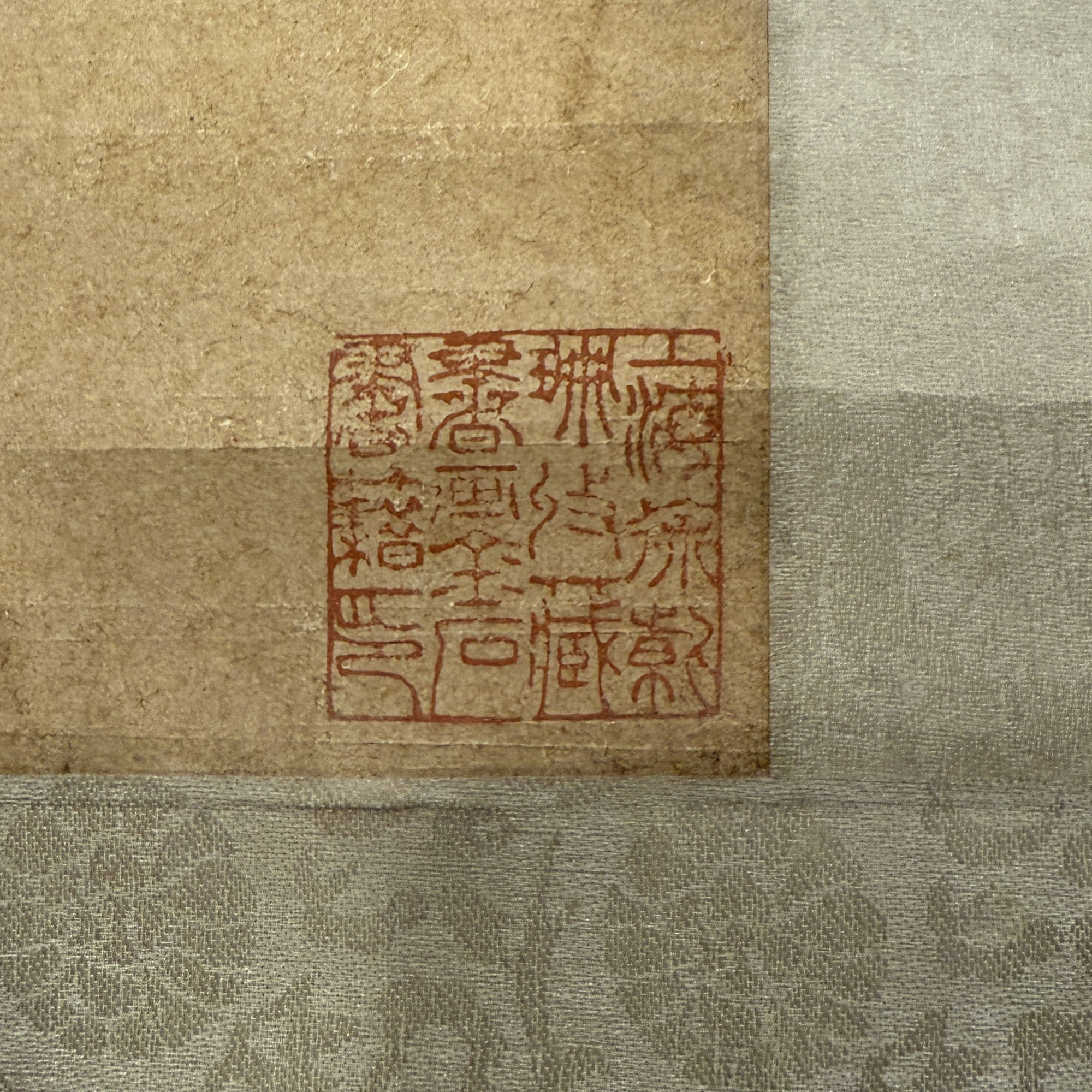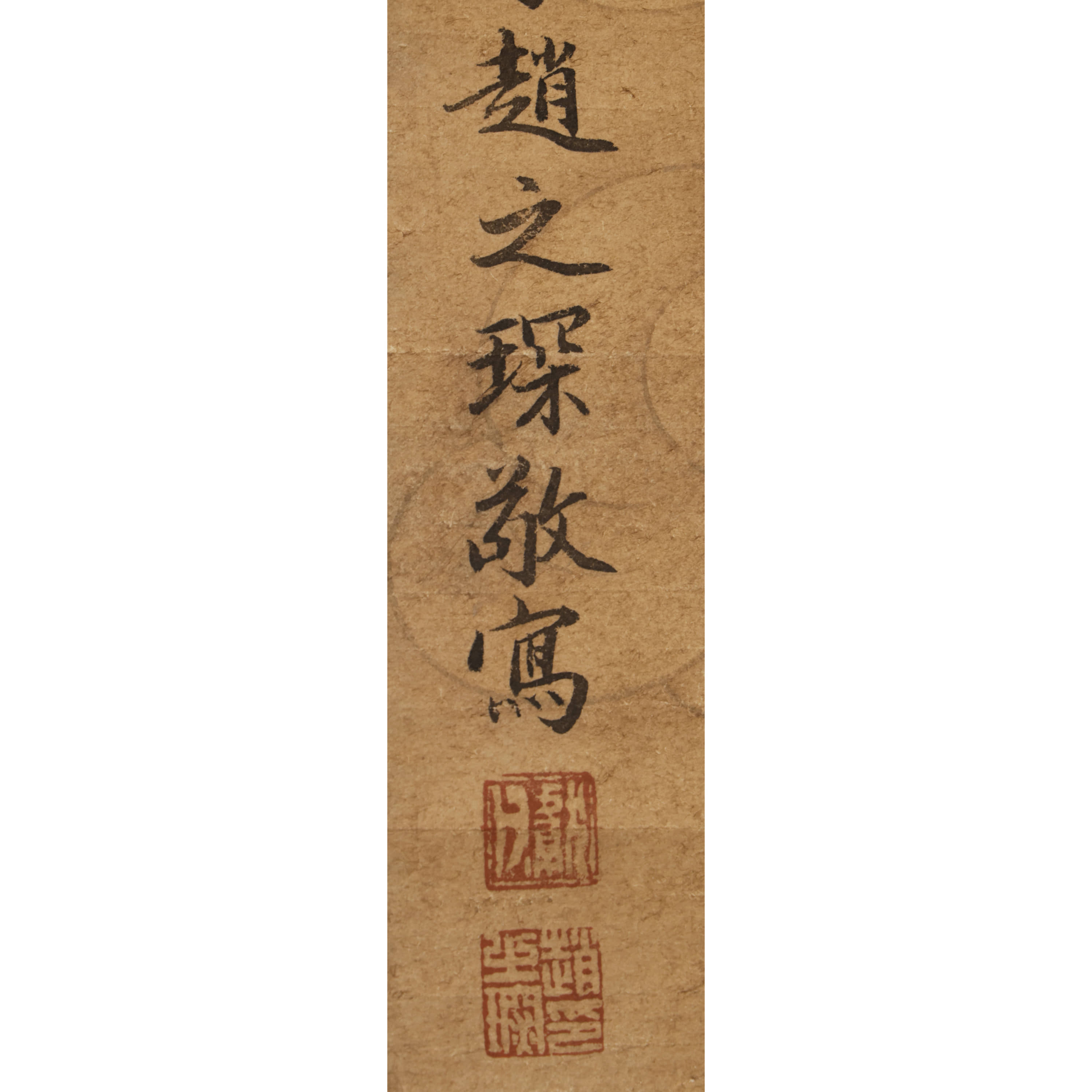 普賢菩薩騎白象踏著祥雲而來,象徵智慧與願行,工筆細緻,線條流暢,墨色沉穩,兼具莊嚴與靈動。趙之琛以篆刻聞名,其繪畫亦承襲金石之氣,筆墨間有碑意。題款「癸卯秋八月」標明創作時間,並附有篆刻印章,展現其金石功力。此幅佛像畫可能是其晚年修心之作,亦可能為供奉或贈人之用。書畫印三者合一,是清代文人畫的典型表現。他的佛像畫作不求艷麗,而重神韻與筆法的古樸,與同時代的工筆彩繪佛畫形成對照。他的題款與印章往往成為畫作的一部分,增添文人書畫的層次。趙之琛傳世的繪畫作品非常少見。