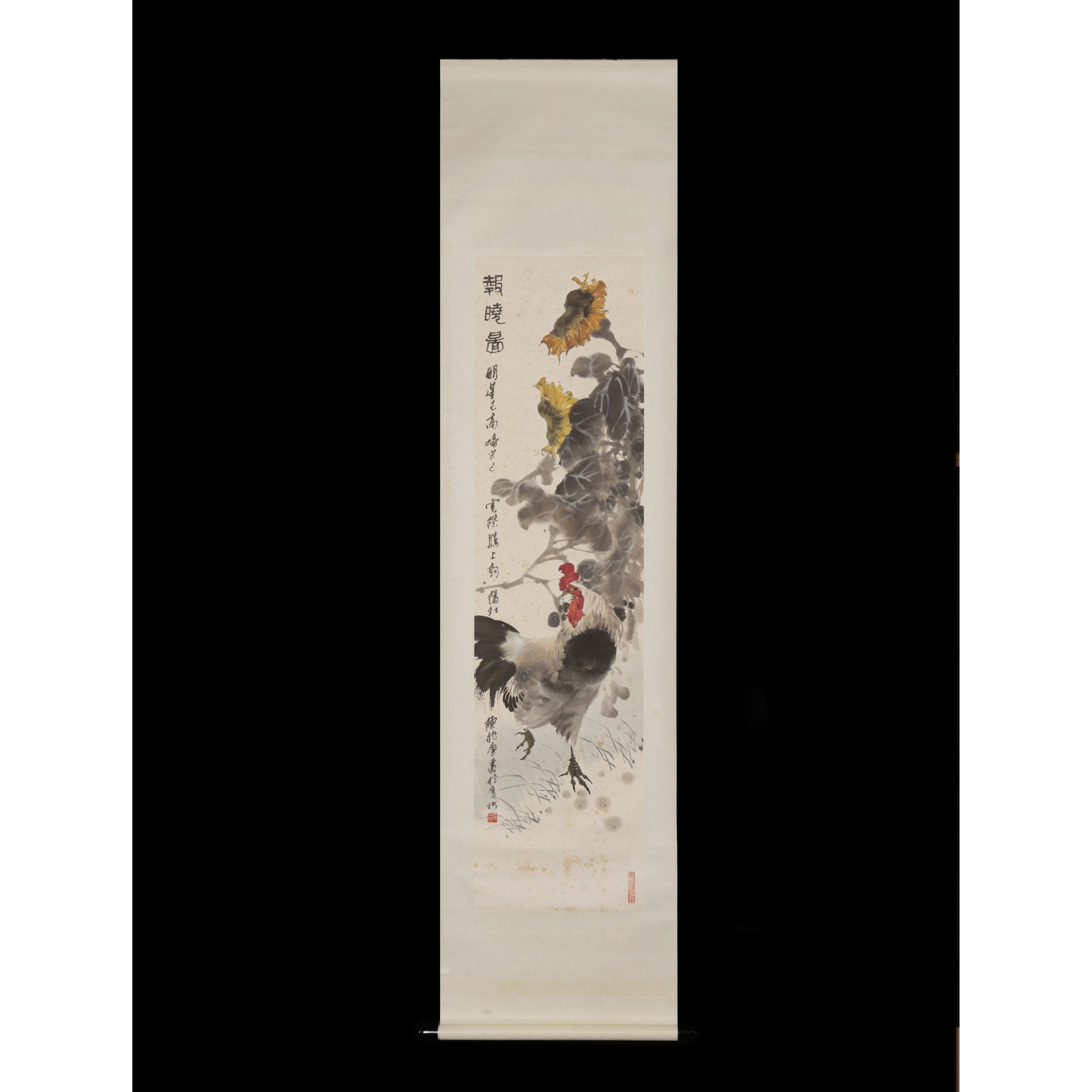 水墨設色紙本,繪雄雞昂首傲立,筆力勁挺塑其筋骨,旁側向日葵墨韻淋漓,借雄雞破曉啼鳴、奮躍向陽的姿態,傳遞出衝破暗夜、奔赴朝暉的蓬勃張力。