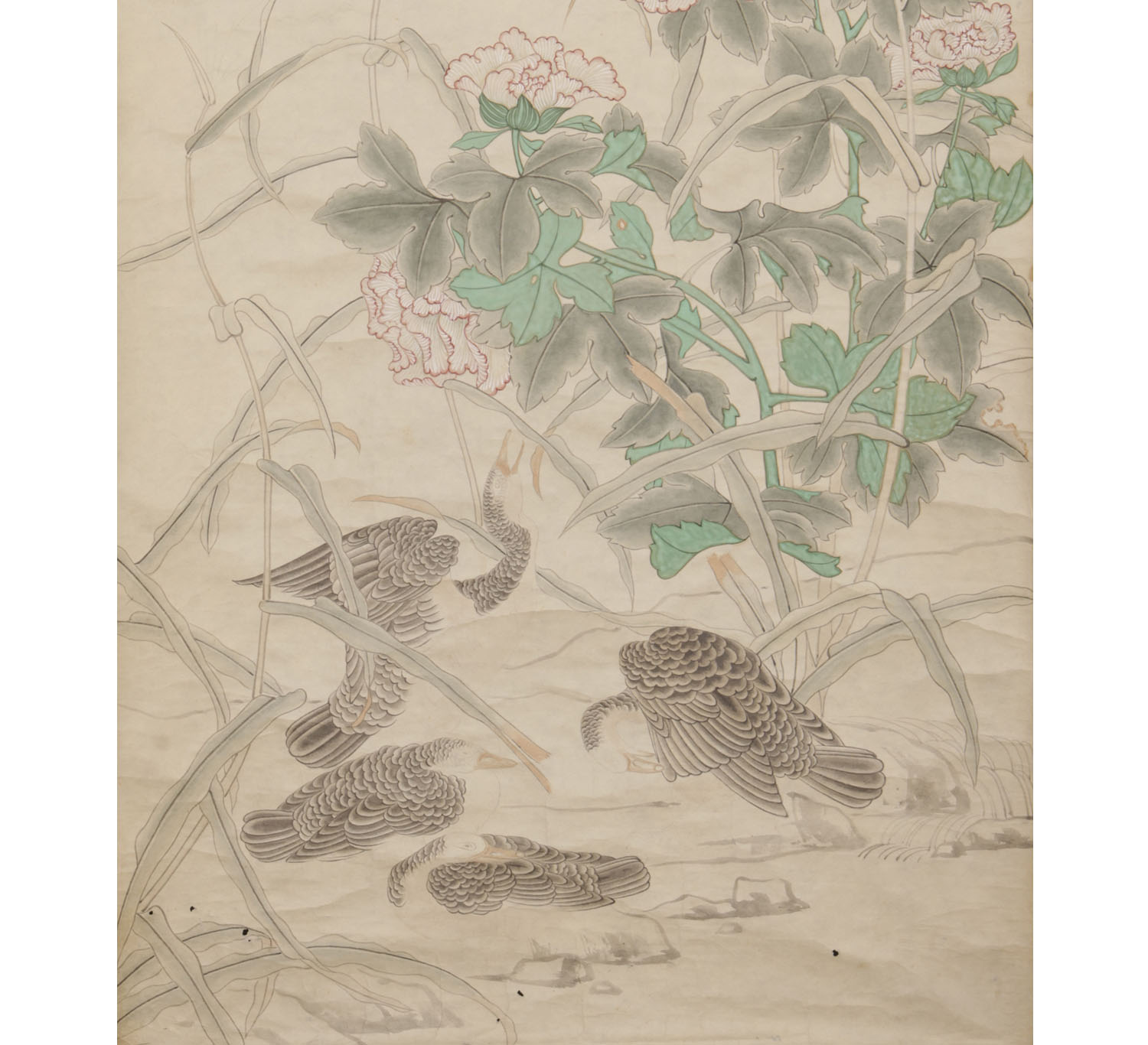 筆法細膩,羽毛層次分明,花瓣線條流暢,設色淡雅,以粉紅、赭石、灰綠為主,色彩層次柔和,為畫稿故未見重彩或金粉;構圖疏密得宜,鳥與花草之間留白自然,動靜相宜,展現文人畫的空靈意境,鴨鵝、牡丹、芙蓉等象徵富貴與祥和,常見於張大千早期花鳥作品。