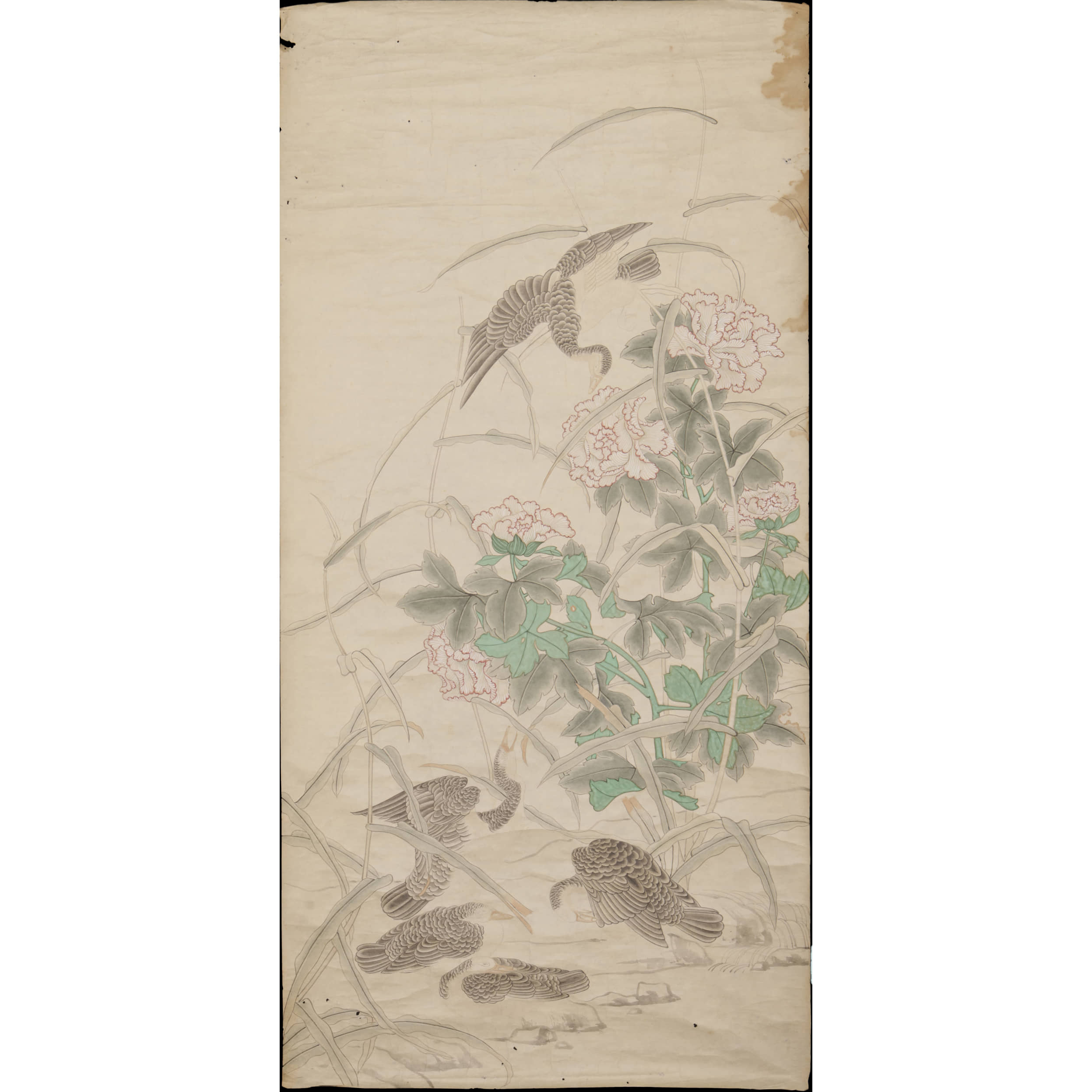 張大千早期作品以工筆花鳥為主,後期才逐漸轉向潑墨與山水。早期工筆花鳥畫稿稀缺,能補足其藝術演變的完整脈絡。線條流暢、設色淡雅,符合工筆畫稿特徵,可能為創作前的構思稿或半成品。牡丹寓意富貴,禽鳥象徵吉祥,符合張大千常用題材,亦具文化意涵。