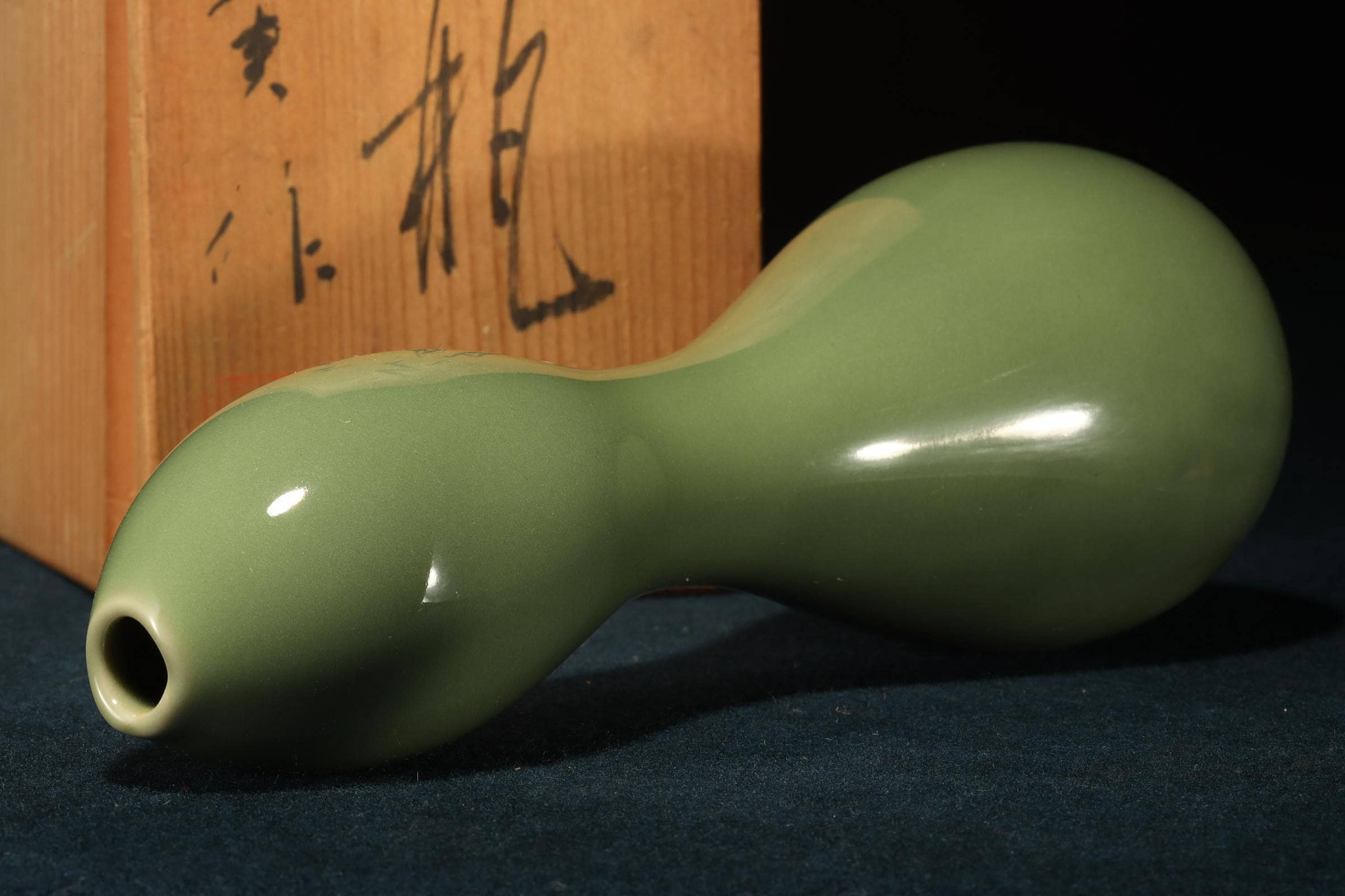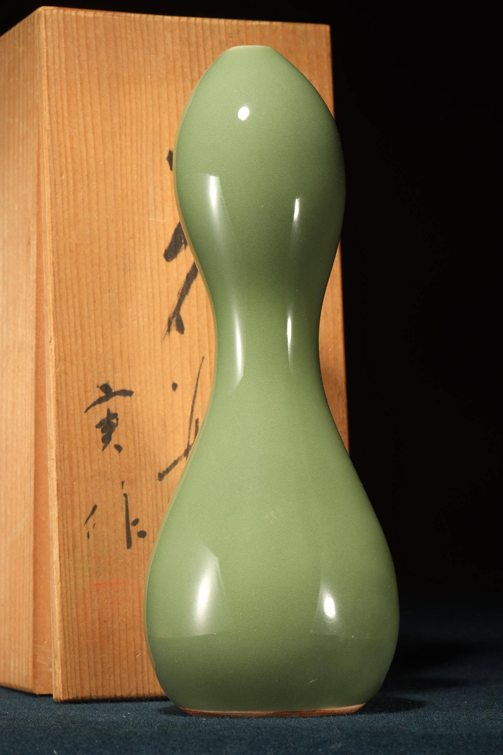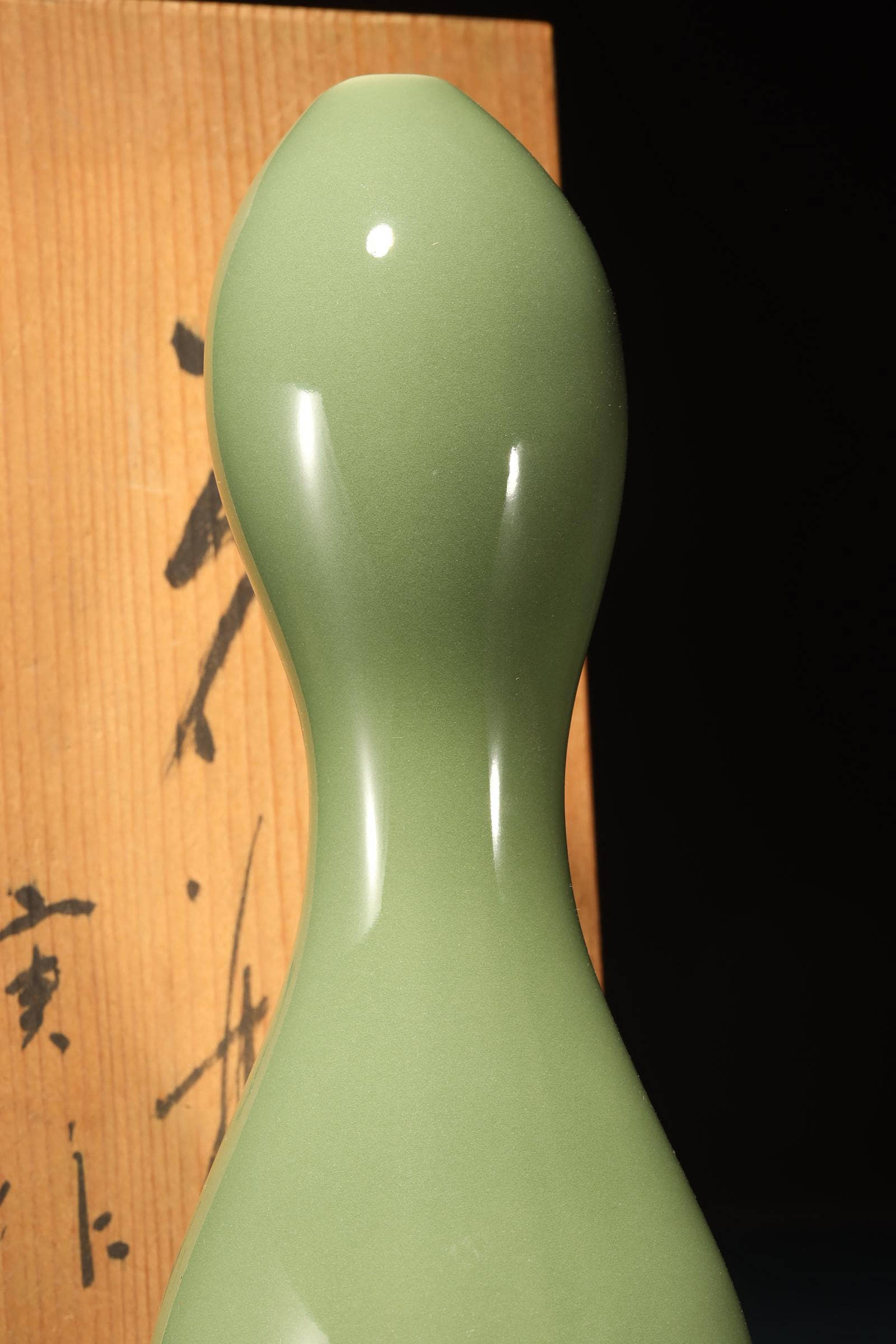 美麗的玉綠色青瓷葫蘆形花瓶,底部有署名「平安實」。它雖然個頭不大,但分量十足,造型簡潔優美。與中國傳統的葫蘆瓶多強調對稱性,呈現一種「規矩之美」不同;加藤實則將葫蘆形拉得更為修長,曲線柔和而不拘泥於絕對對稱,瓶身上下段的比例並非嚴格均分,而是透過細微的差異,營造出一種自然生成的感覺,彷彿植物的生長曲線。雖然承襲古典器形,但加藤實的線條更流暢,避免了「刻板」的對稱,讓作品在視覺上更具動態與呼吸感。釉色是一種偏灰的玉綠色,屬於青瓷系,瓷感細膩,釉水盈潤,高溫窯工藝,質感壓手,品相好,原木箱。瓢形器物在日本茶道與花道中常被視為雅器,既有實用性,也承載祝福寓意。