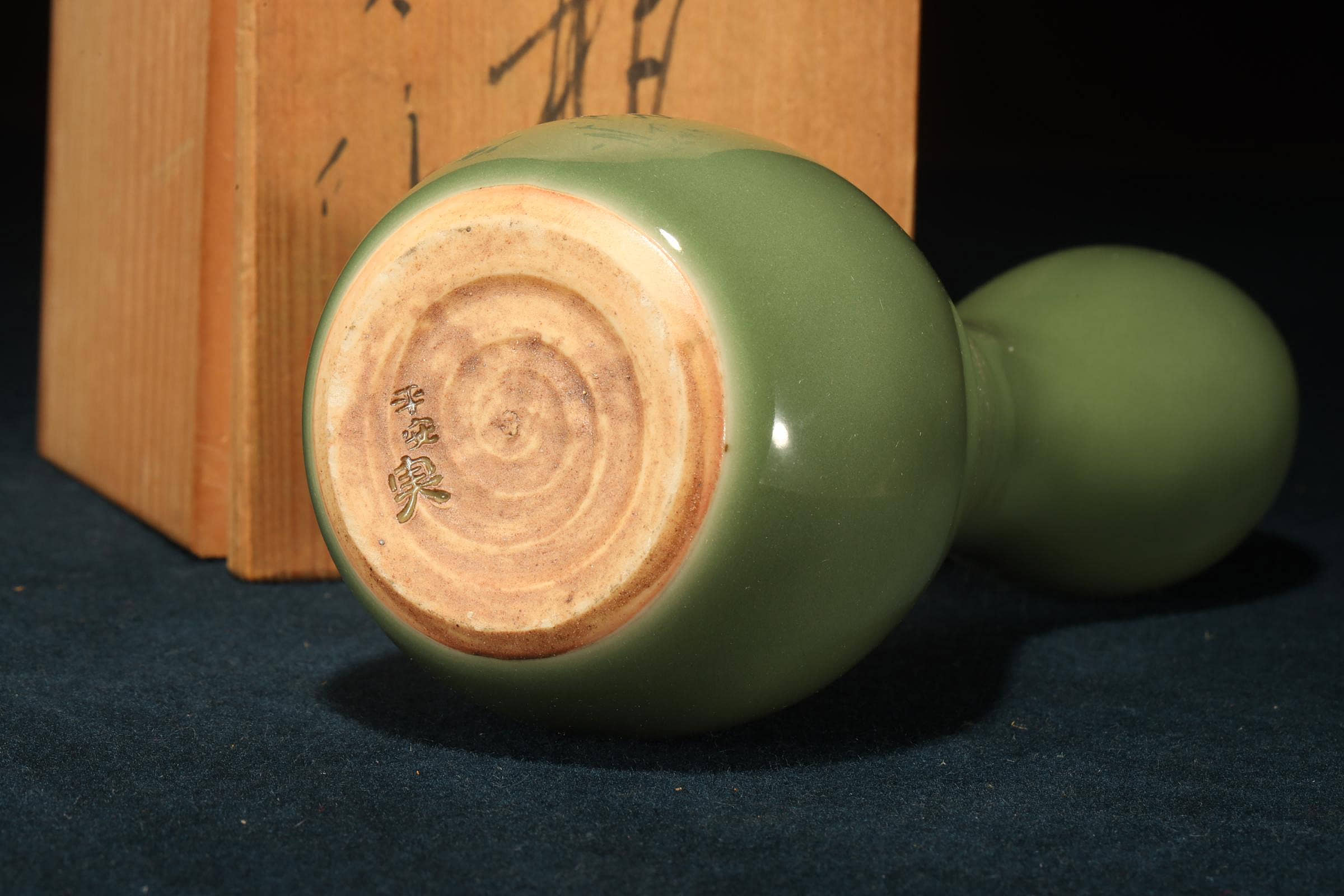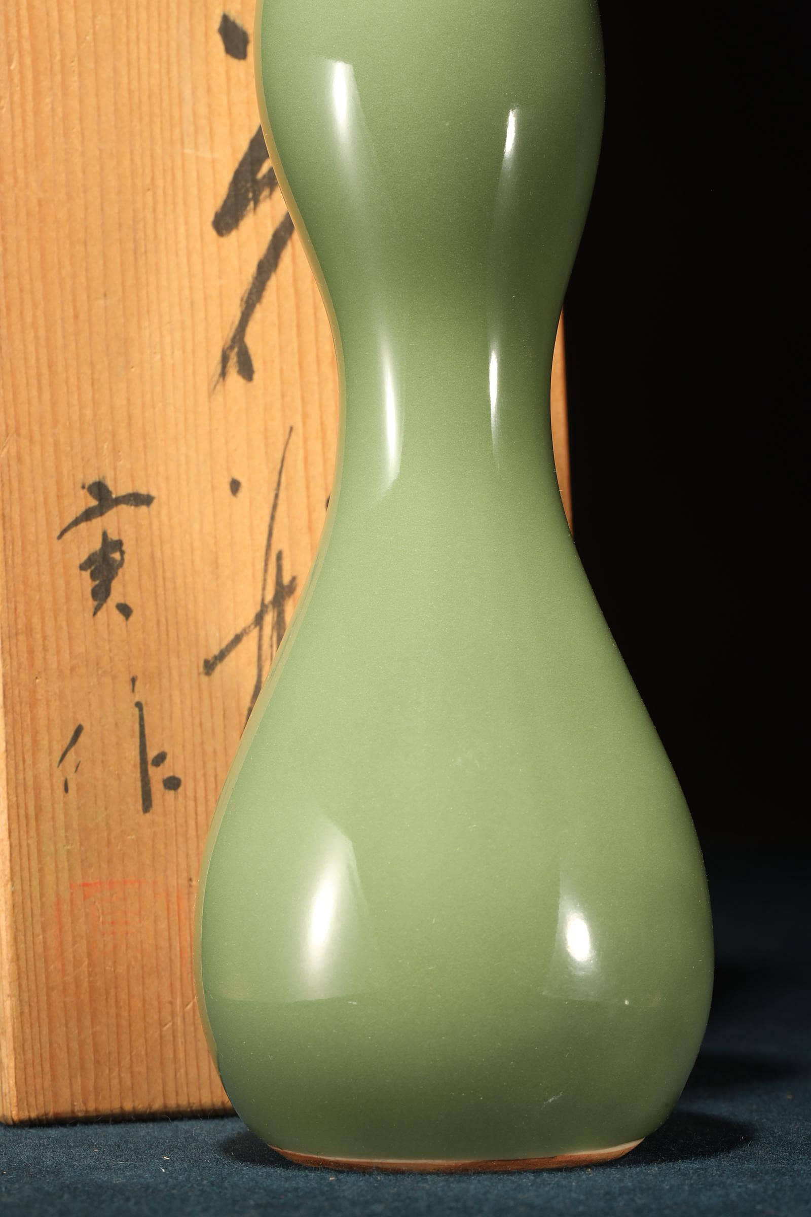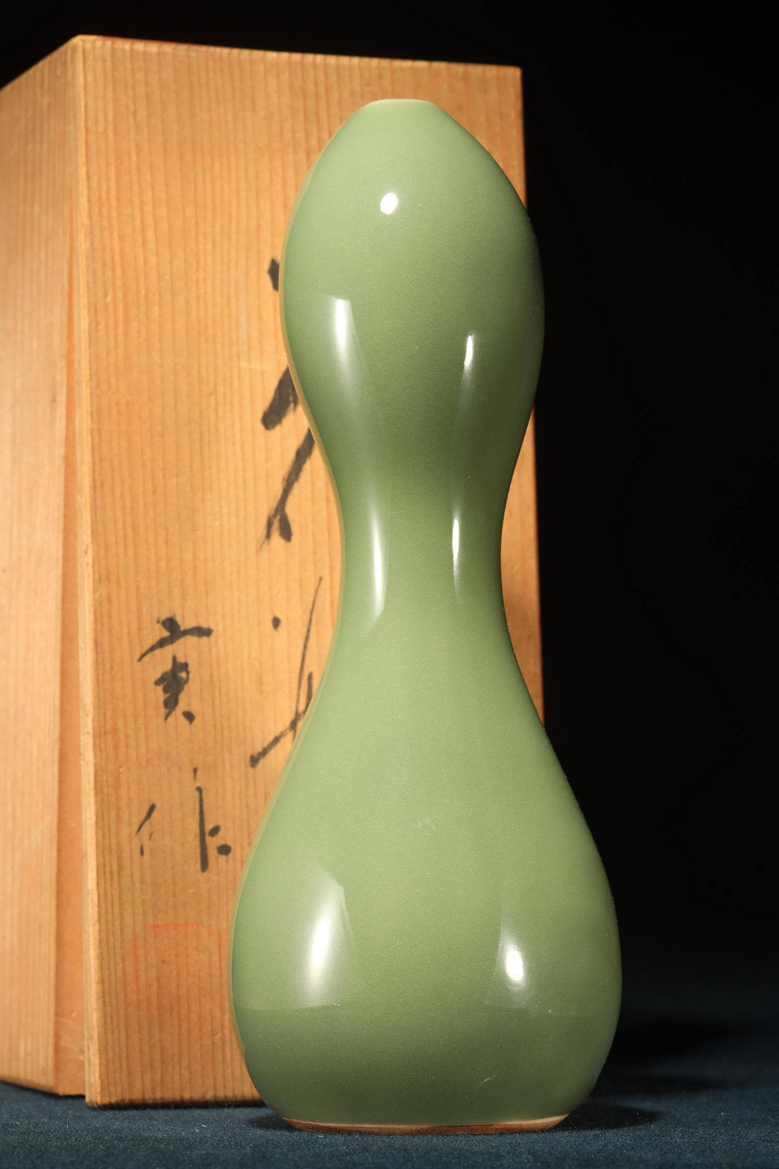 美麗的玉綠色青瓷葫蘆形花瓶,底部有署名「平安實」。它雖然個頭不大,但分量十足,造型簡潔優美。與中國傳統的葫蘆瓶多強調對稱性,呈現一種「規矩之美」不同;加藤實則將葫蘆形拉得更為修長,曲線柔和而不拘泥於絕對對稱,瓶身上下段的比例並非嚴格均分,而是透過細微的差異,營造出一種自然生成的感覺,彷彿植物的生長曲線。雖然承襲古典器形,但加藤實的線條更流暢,避免了「刻板」的對稱,讓作品在視覺上更具動態與呼吸感。釉色是一種偏灰的玉綠色,屬於青瓷系,瓷感細膩,釉水盈潤,高溫窯工藝,質感壓手,品相好,原木箱。瓢形器物在日本茶道與花道中常被視為雅器,既有實用性,也承載祝福寓意。