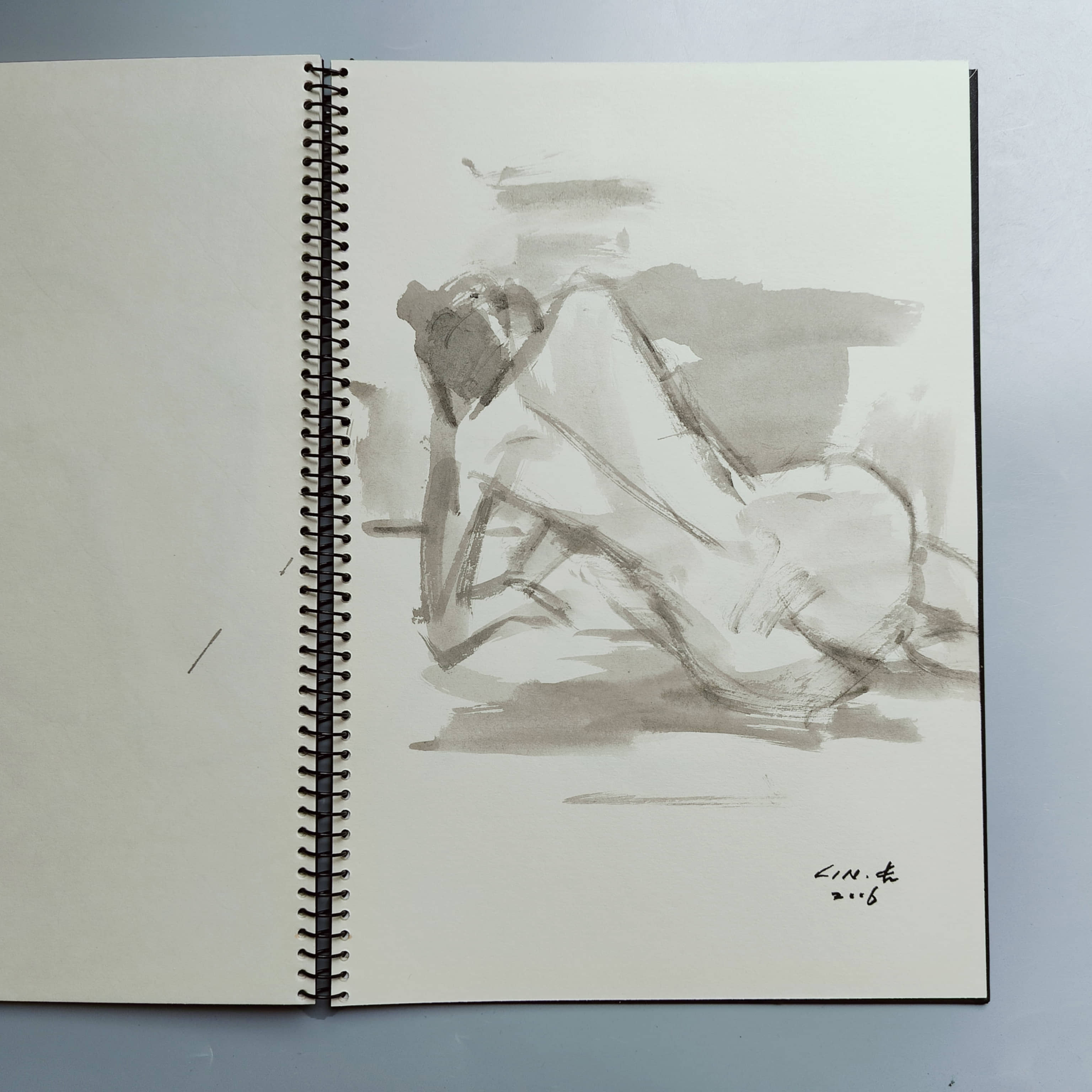 速寫冊頁:在藝術教育與創作中,速寫是訓練觀察力與手眼協調的重要方式,也常作為創作前的構圖練習。人體是藝術史中最具挑戰性的題材之一,林長雄以自由筆觸描繪人體,展現其對生命與動態的敏感度。筆法近似東方水墨的「寫意」,但結構與比例則承襲西方素描訓練,形成獨特風格。