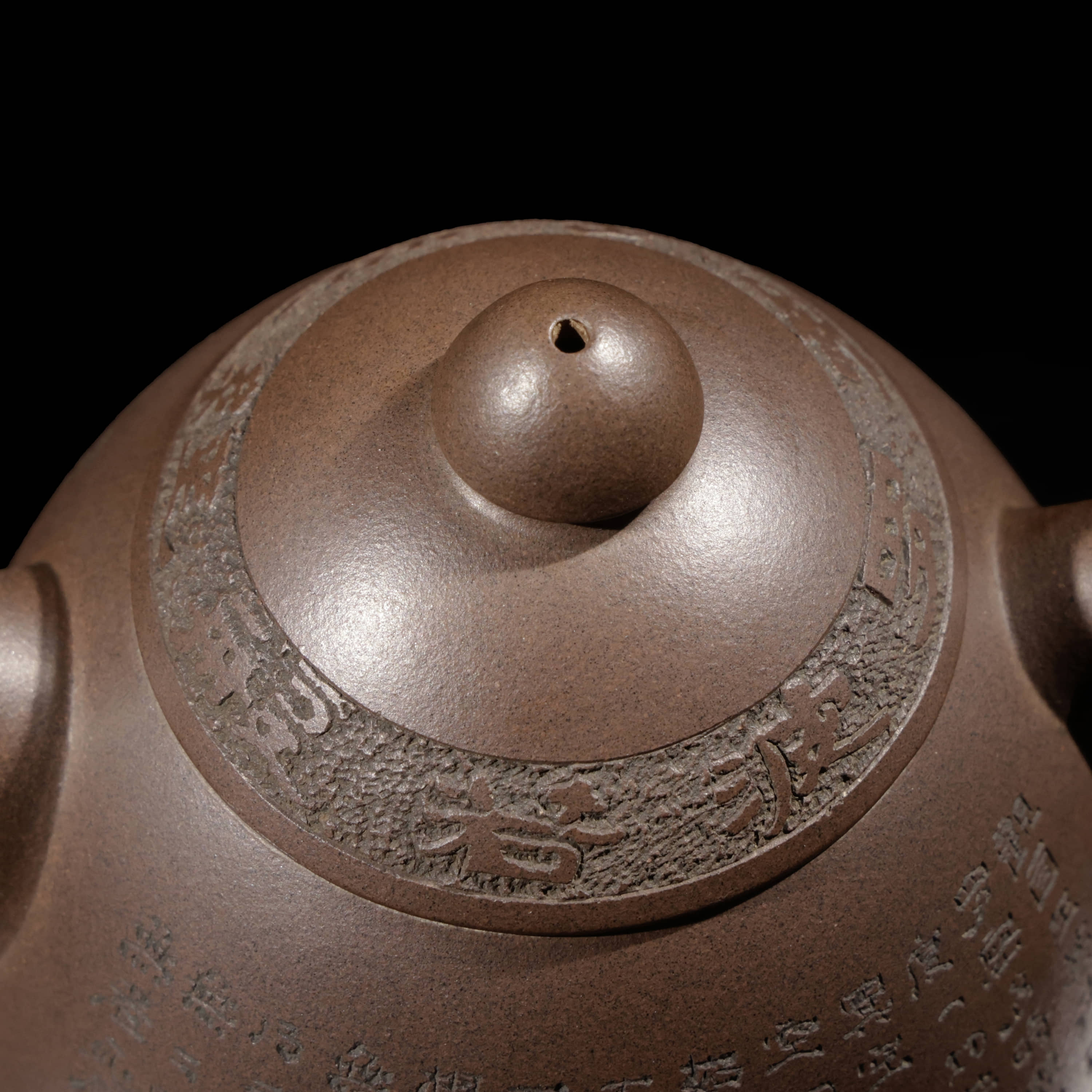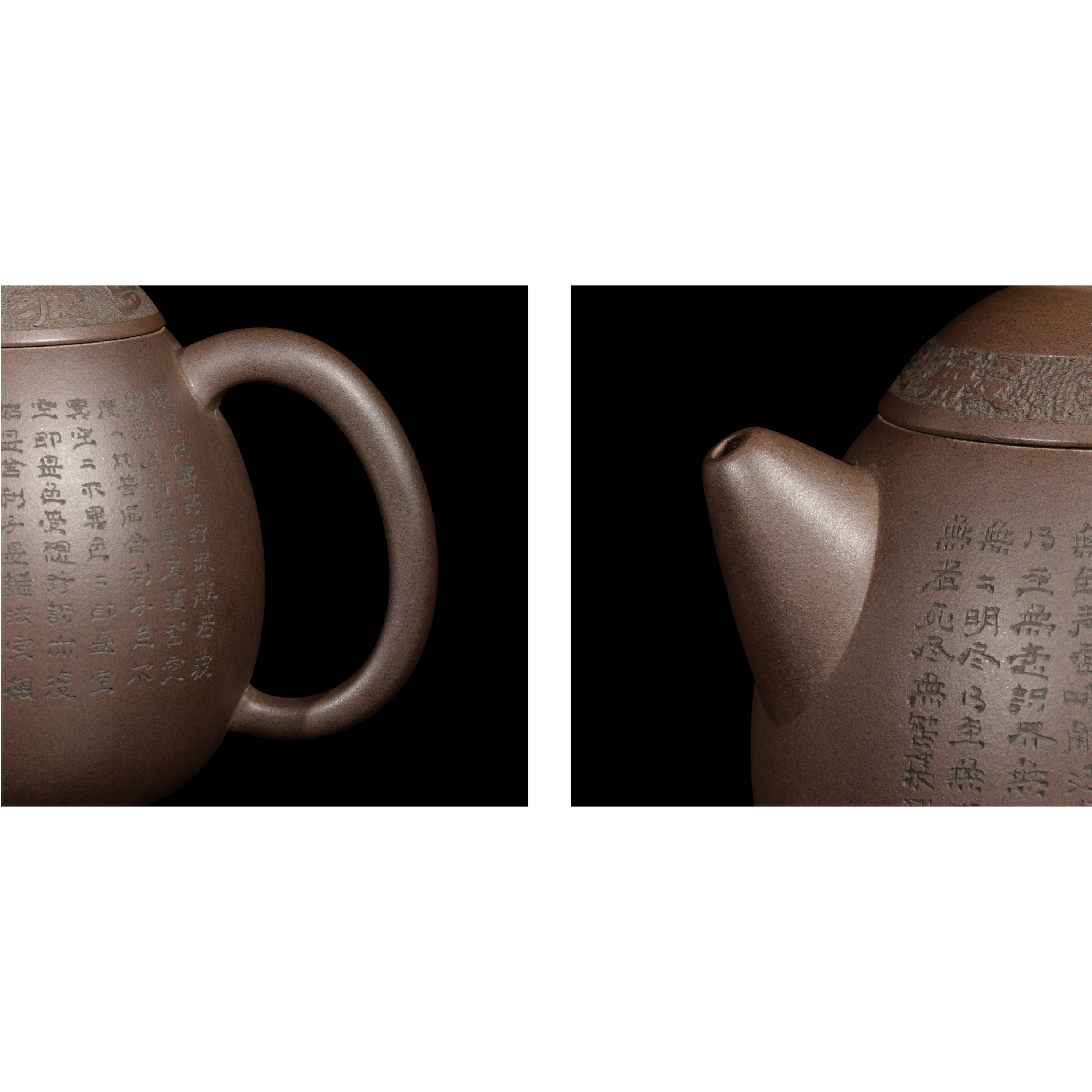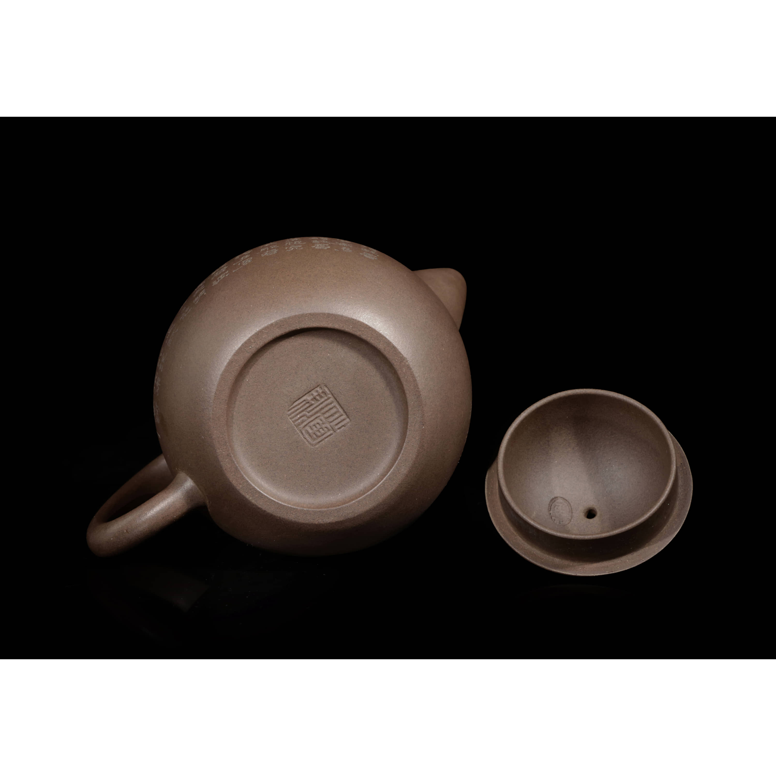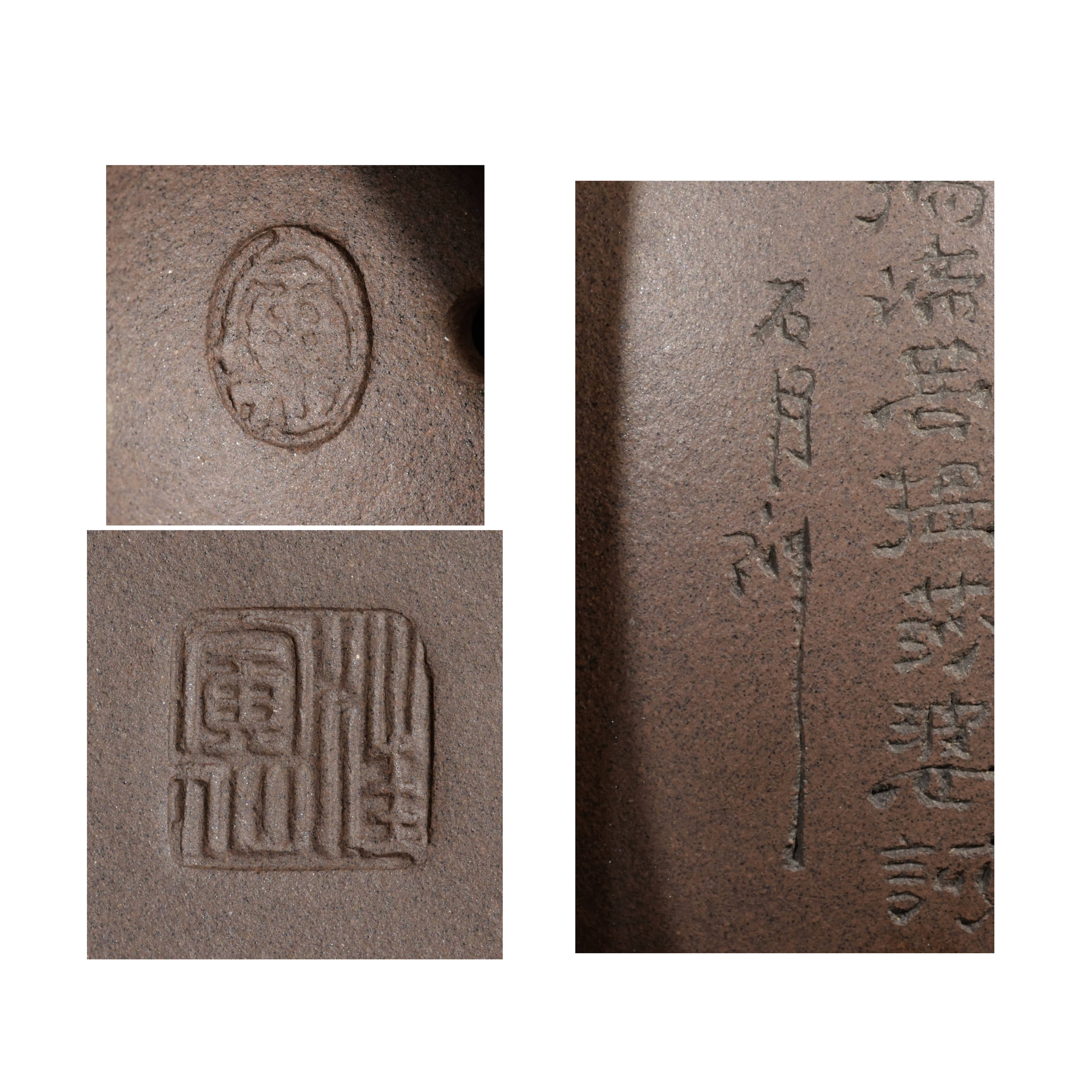 紫砂壺上的刻字(陶刻)是將書法、繪畫與金石藝術融入壺身的傳統工藝,能提升壺的藝術價值與文化底蘊,亦有「壺隨字貴」之稱。早期多為明清文人雅士的詩詞題刻,在生胚或熟胚的壺體上刻畫。字跡有凹凸變化,深淺不一,筆畫邊緣有「崩砂」現象,具有線條的靈動感。刻字後不上色的稱為「清刻」,以手寫的筆意和書法韻味來區分其是否為名家手工陶刻。「壺隨字貴,字隨壺傳」。當一位製壺工藝精湛的陶手,遇上了一位功力深厚的陶刻家,這把壺的價值往往不是相加,而是相乘。市面上很少見到滿身刻繪的朱泥壺的原因是因為太難了!若有緣遇到,請務必多看兩眼,這絕對是高手中的高手所為,價值通常不斐。