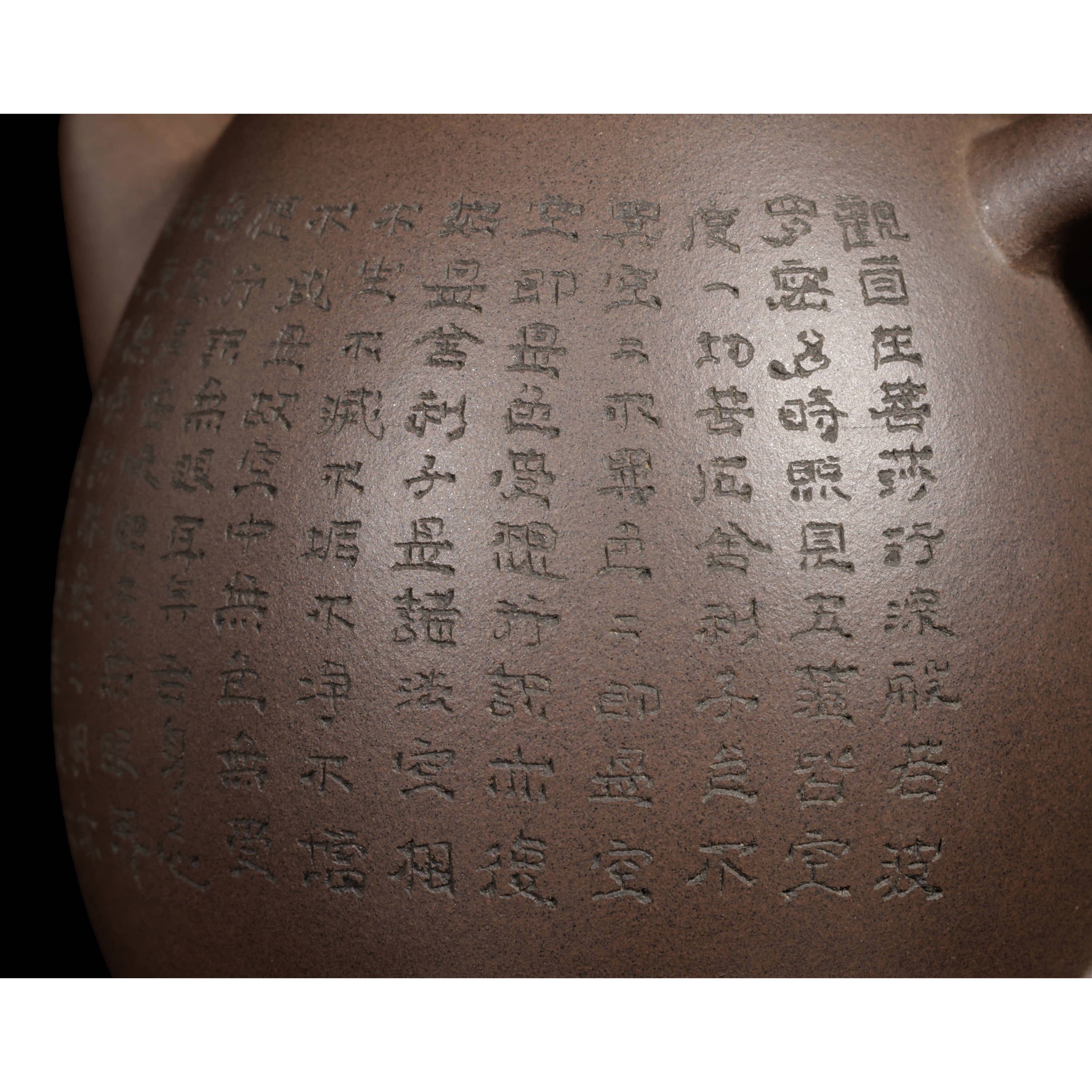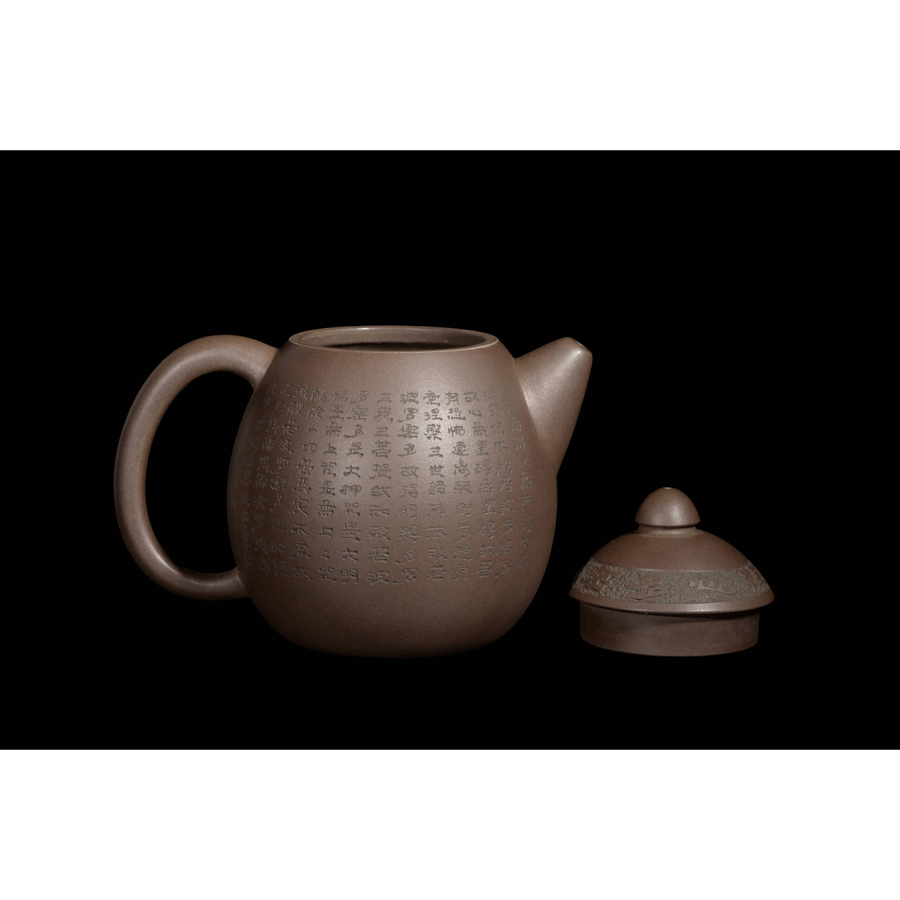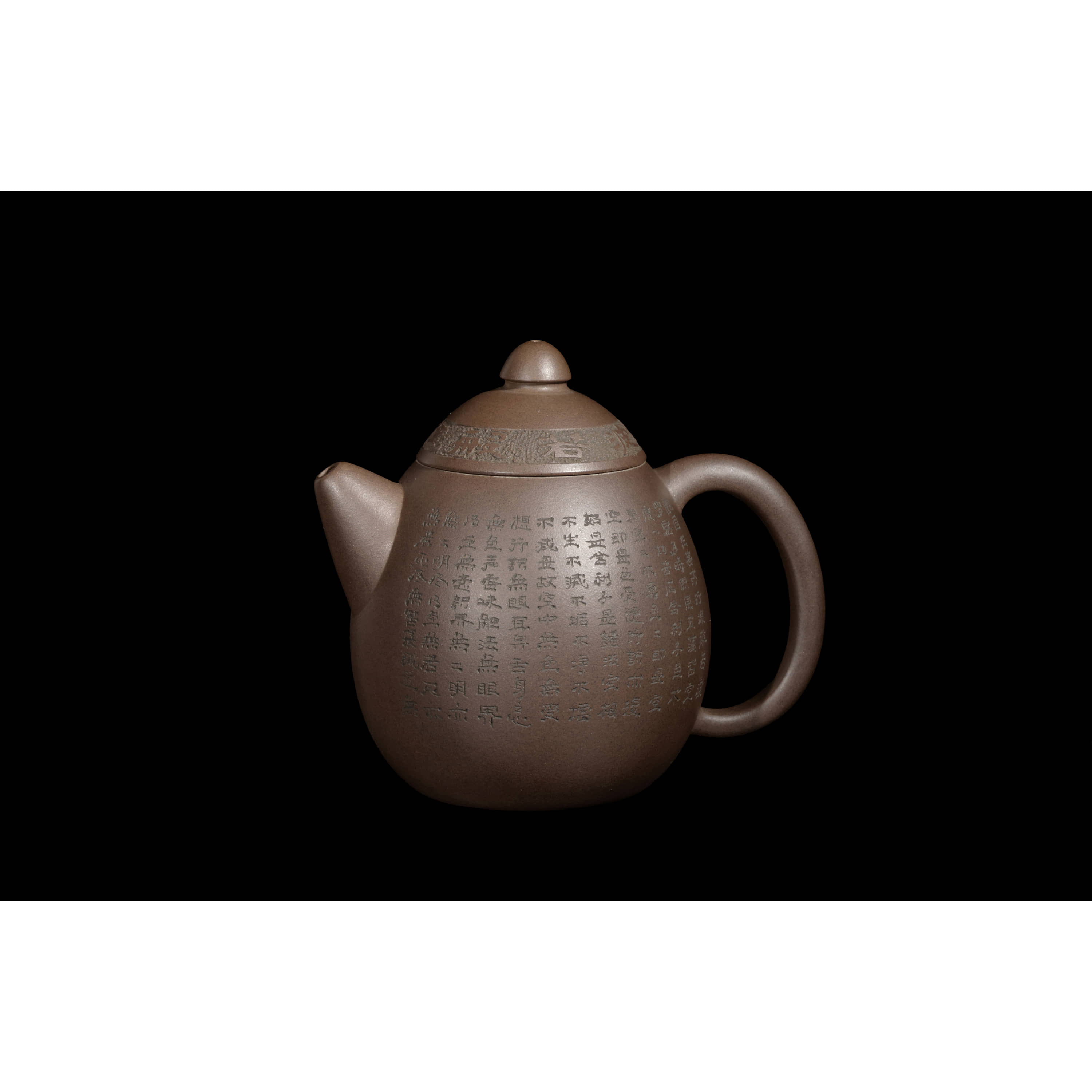 紫砂龍蛋壺,泥料細膩縝密,色澤沈穩內斂,表面肌理明晰,觸手勻潤,壺身面施刻陶技法清刻《般若波羅蜜多心經》全文,字跡蒼勁挺秀,落款:石月刻。壺身飽滿圓潤,線條流暢簡練,蓋上拱起安圓鈕,設直流嘴胥出自然,出水順暢,環把曲弧有致,比例協調勻稱。壺蓋浮刻「般若波羅蜜多心經」一圈八字,字跡蒼勁挺秀,整制運藝老練嚴謹,工法精到,韻致端莊雅致。壺底印款:汪寅仙。