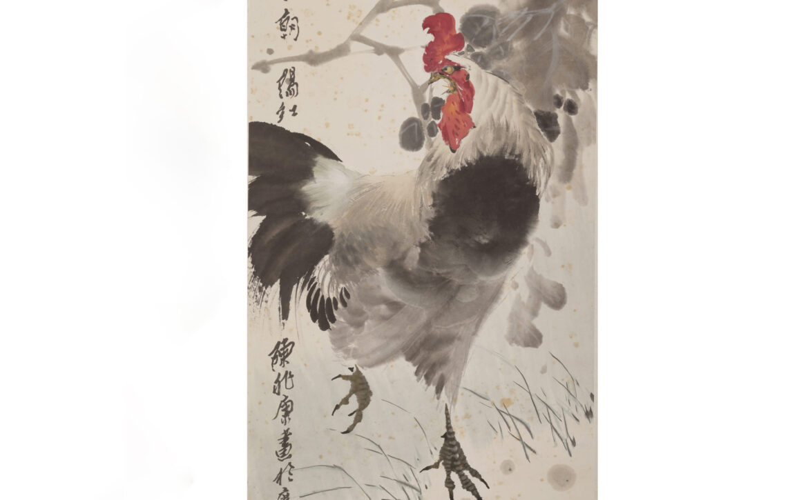 這幅《報曉圖》為陳兆康所作,是一件典型的當代名家水墨立軸作品,融合了寫意花鳥技法與文化寓意,展現出畫家深厚的筆力與精神寄託。水墨設色紙本,繪雄雞昂首傲立,筆力勁挺塑其筋骨,旁側向日葵墨韻淋漓,借雄雞破曉啼鳴、奮躍向陽的姿態,...