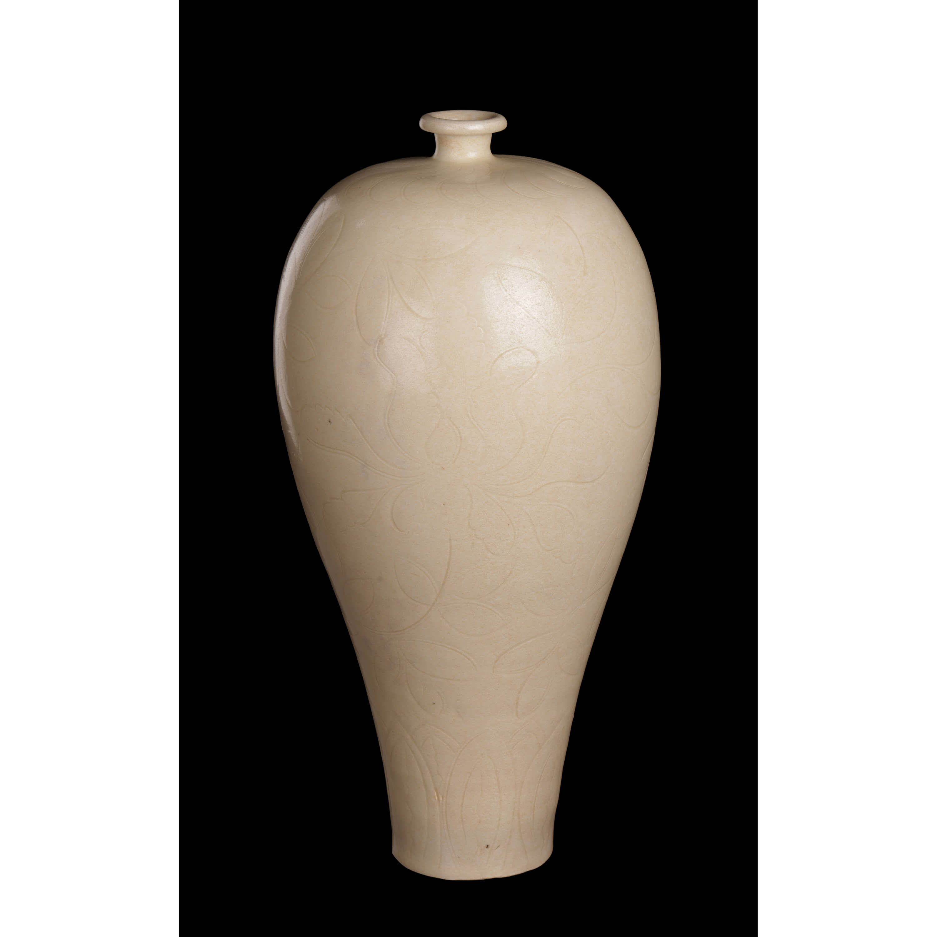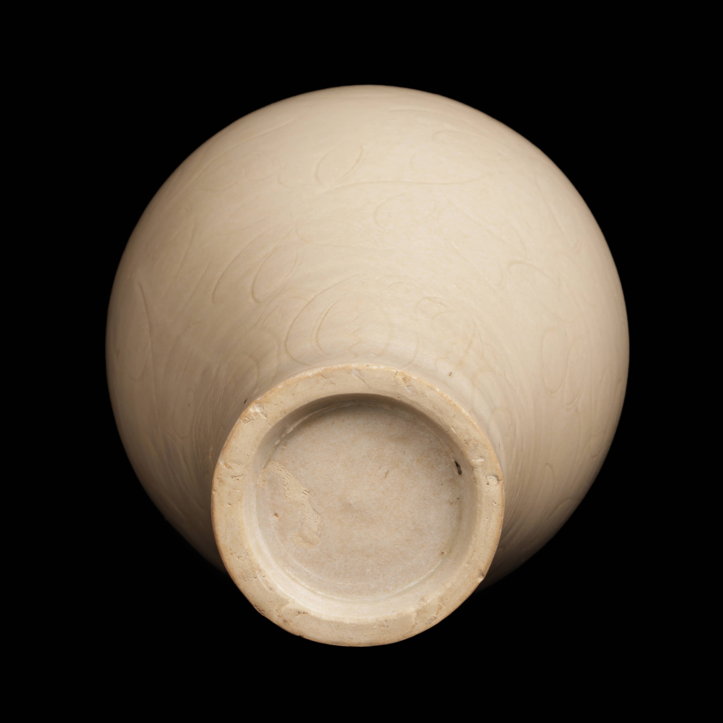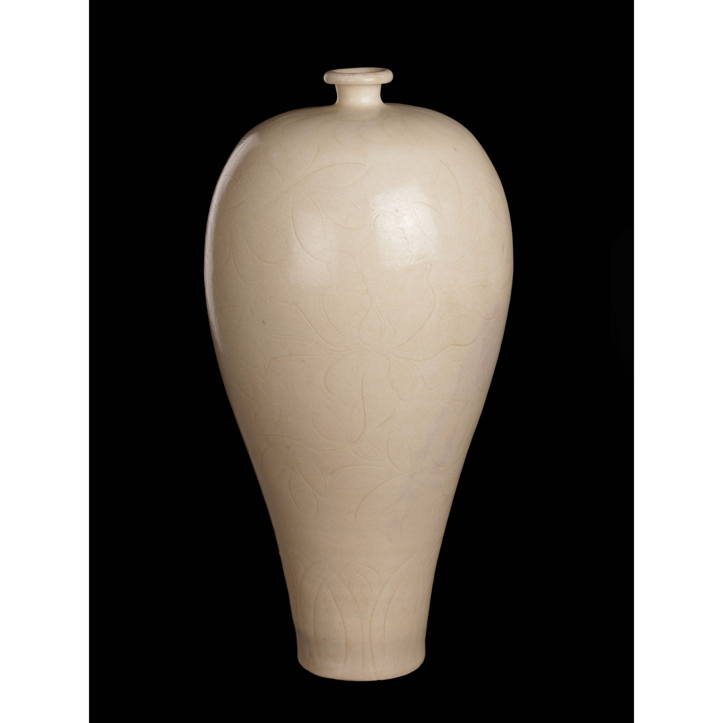 定窯劃花蓮紋梅瓶,是宋代定窯梅瓶的標準式樣,器形端莊,線條曼妙,小口、短頸、豐肩,肩下漸收斂,圈足。器身以劃花為飾,主紋為折枝蓮花,輔以蓮瓣紋,通體施牙白釉,白中閃黃,釉質瑩潤,肩部刻劃菊瓣紋一周,腹部刻纏枝蓮紋,脛部刻上仰蕉葉紋,刻花清晰,刀法婉轉,深淺不一,特別是所刻蓮花,簡潔典雅,線條流暢,顯示刻花技術的嫻熟。足緣無釉。
