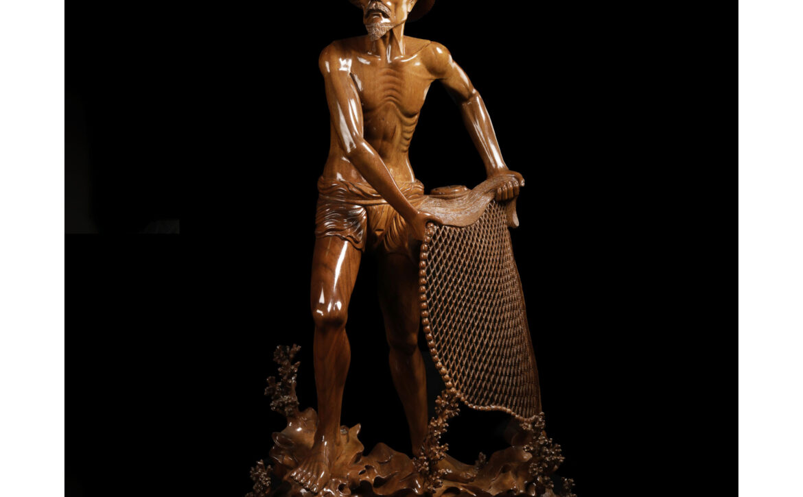 這件來自峇里島的木雕作品,通體取材木料刻之,質材縝密沉實,以漁翁灑網為主題,雕作漁翁頭戴草帽,身著短褲,魚簍繫於腰間,胸骨嶙峋,腿部肌肉線條分明,盡顯勞作磨礪出的身形特質,其雙手緊握漁網,目光凝視前方,似等待捕撈的最佳時機。...