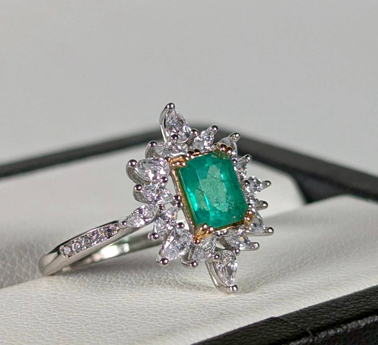 此天然祖母綠戒指,主石來自世界最著名的祖母綠產地之一,呈現濃郁、純正的綠色,略帶藍調,被稱為「木佐綠(Muzo-Green)」,呈絲綢般玻璃光澤,採八邊形(Octagon)切割,色澤精緻柔和。周圍鑽石以馬眼形與圓形切割交錯排列,形成星芒般的光芒效果。尺寸0.82克拉(6.85*5.31mm),尺寸適中,佩戴感舒適又不失存在感。戒身以925純銀打造,整件工藝精湛,氣質高雅大方,融合古典與現代,適合正式場合或日常佩戴。台大國際寶石鑑定所證書。