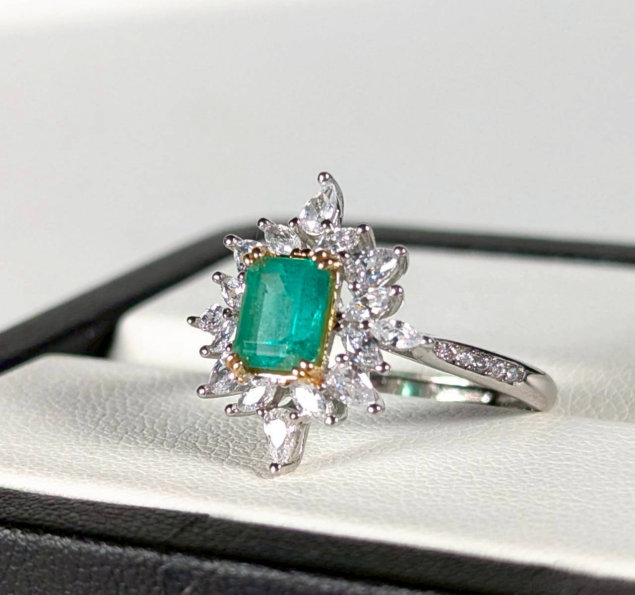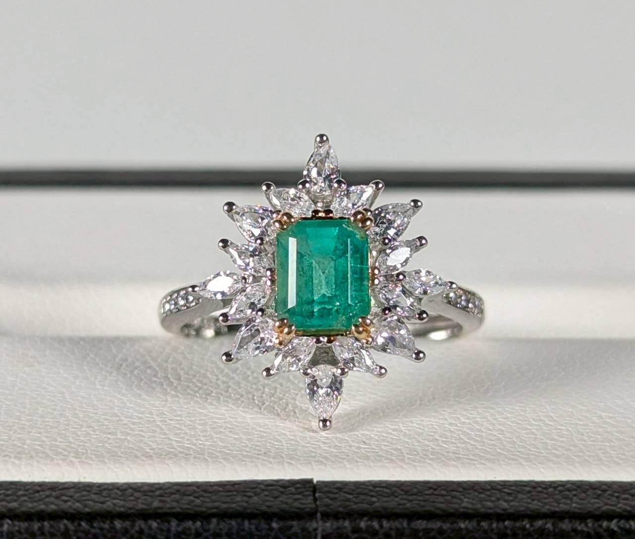 此天然祖母綠戒指,主石來自世界最著名的祖母綠產地之一,呈現濃郁、純正的綠色,略帶藍調,被稱為「木佐綠(Muzo-Green)」,呈絲綢般玻璃光澤,採八邊形(Octagon)切割,色澤精緻柔和。周圍鑽石以馬眼形與圓形切割交錯排列,形成星芒般的光芒效果。尺寸0.82克拉(6.85*5.31mm),尺寸適中,佩戴感舒適又不失存在感。戒身以925純銀打造,整件工藝精湛,氣質高雅大方,融合古典與現代,適合正式場合或日常佩戴。台大國際寶石鑑定所證書。