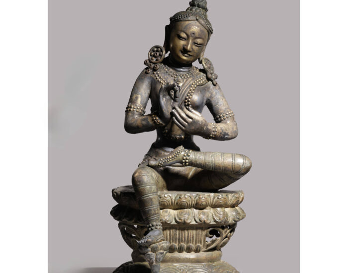 這尊佛像是一尊尼泊爾風格的綠度母造像,其歷史可能追溯至19世紀或更早。度呈坐姿,面容細緻優雅,鼻樑高挺,雙目細長,眉如新月,雙唇微抿,慈穆祥和,呈現優雅而慈悲形象法相莊。左腿舒放橫盤,右腿腳踏蓮花,半跏趺坐於仰覆蓮花鏤空高台座,雙層蓮花瓣靠近台座的上部。頭頂束高髮髻,配上大耳環,微微側首似在傾聽。雙手持說法印,法身三折枝姿,呈現柔和的軀幹曲線與輪廓,極富動感,其右腳伸出,踏在蓮花上,象徵著她隨時準備起身救度苦難眾生。綠度母是藏傳佛教中的一位菩薩,被視為觀世音菩薩的化身,能解救眾生苦難,整觀作工嫻熟,韻致敦雅雋古,極富美感。