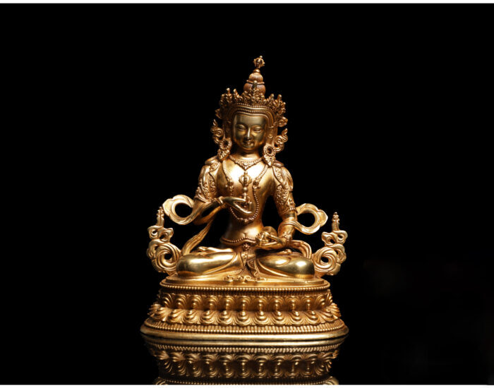 金剛薩埵(Vajrasattva)以銅合金為胎,外施鎏金,呈現尊貴光澤,是密教重要本尊之一,象徵清淨、懺悔與淨化。菩薩法相寧和,面容圓潤,眉眼細長,帶有寧靜微笑,坐於雙層仰覆蓮瓣蓮座,結跏趺坐,右手持金剛杵(vajra),左手持鈴(ghanta),象徵智慧與方便的雙運。身著菩薩裝,戴五葉寶冠,飾以瓔珞,儀態端莊肅穆,整制工藝精湛老練,氣韻莊雅雋永,風格融合帕拉藝術與藏地審美。