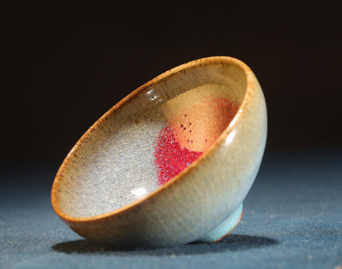 茶盞呈現經典的圓潤輪廓,口沿略收,腹部圓潤有泡泡盞的曲線,盞身高低適中,曲線流暢,底部收束成小圈足,適合手持品茗。整體以深藍至青藍為基調,釉面光澤柔和,在特定角度下呈現微妙的色彩層次,盞內一抹紅色斑點如火焰般在藍釉中綻放,有如晚霞映照水面,形成強烈視覺焦點,圈足及底部露胎未施釉,小圈足對於茶湯的保溫有利,減少熱量傳導逸失。日本的鈞釉主要受中國鈞窯啟發而製作的,具有藍色與紫紅色窯變效果的釉色瓷器,日本工匠在學習中國陶瓷技術的過程中,也對鈞窯的窯變藝術產生興趣,並進行仿製和改良,通常在近代(如大正時期約1912-1926)製作,帶有類似中國鈞窯(尤其是宋元鈞窯)那種藍中帶紫、紅斑的窯變釉色,這些器物模仿了中國宋元鈞窯的窯變神韻。
