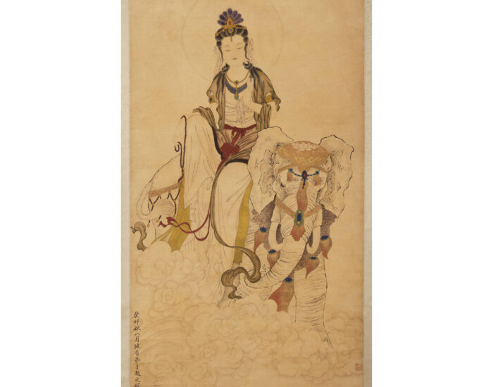 普賢菩薩騎六牙白象踏著祥雲而來,象徵智慧與願行,工筆細緻,線條流暢,墨色沉穩,兼具莊嚴與靈動。趙之琛以篆刻聞名,其繪畫亦承襲金石之氣,筆墨間有碑意。題款「癸卯秋八月」標明創作時間,並附有篆刻印章,展現其金石功力。此幅佛像畫可能是其晚年修心之作,亦可能為供奉或贈人之用。書畫印三者合一,是清代文人畫的典型表現。他的佛像畫作不求艷麗,而重神韻與筆法的古樸,與同時代的工筆彩繪佛畫形成對照。他的題款與印章往往成為畫作的一部分,增添文人書畫的層次。趙之琛傳世的繪畫作品非常少見。