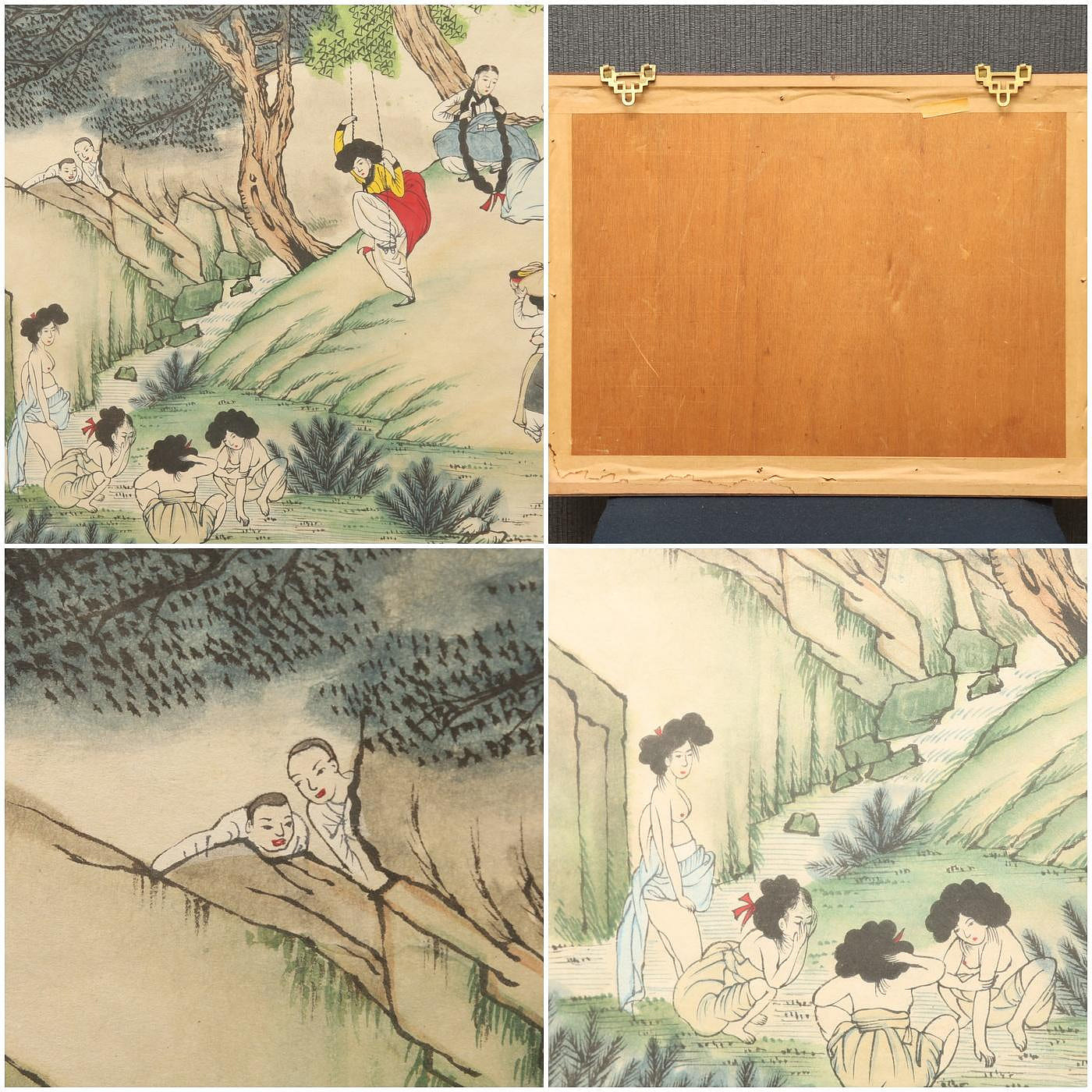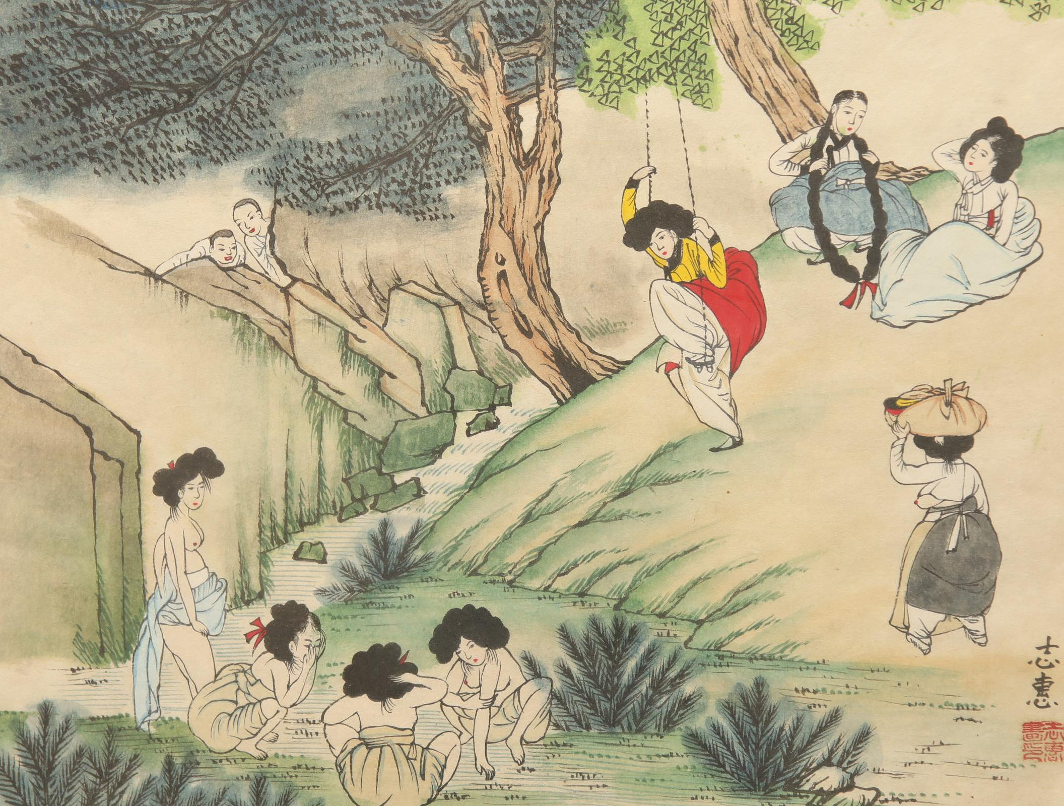 • 偷窺的小和尚:在畫面的右上方岩石後方,藏著兩名正在偷看婦女洗澡的小和尚,為整幅畫增添了幽默與世俗化的趣味。