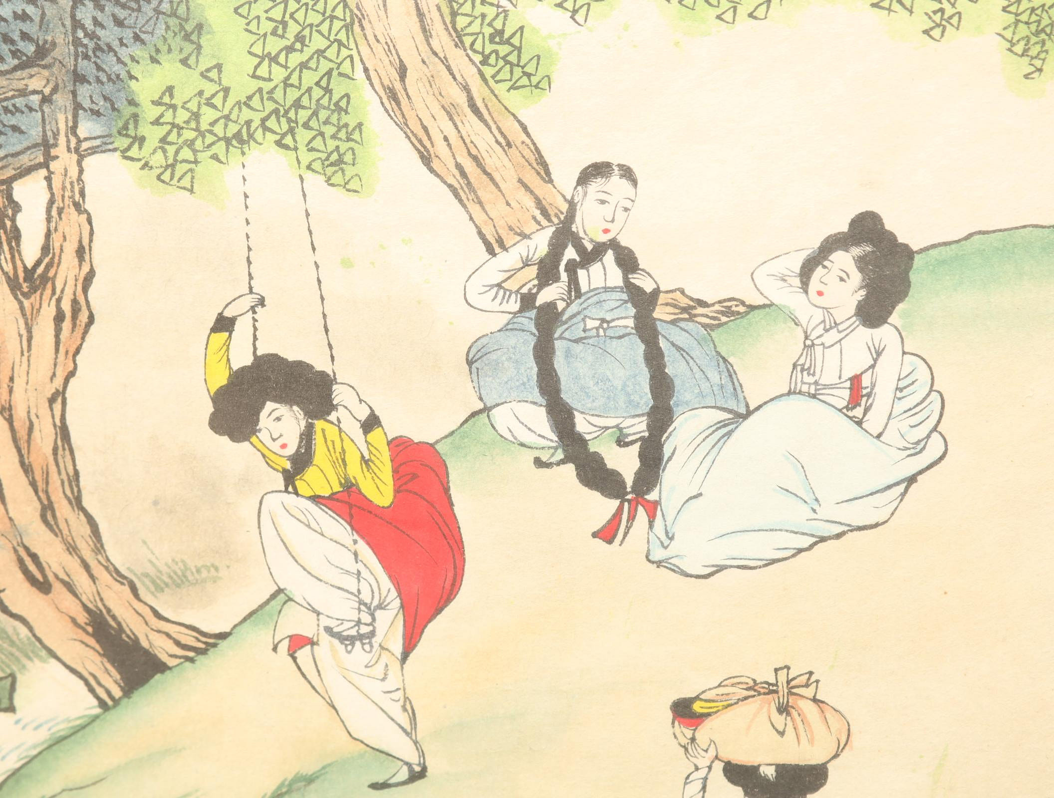 • 視覺中心:畫面的焦點是一名穿著鮮豔黃衣紅裙、正在盪鞦韆的女子,這是端午節的傳統體育活動,身後的女子則有人在整理頭髮。